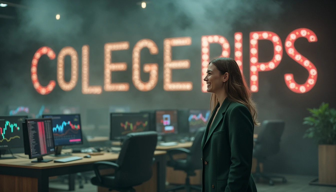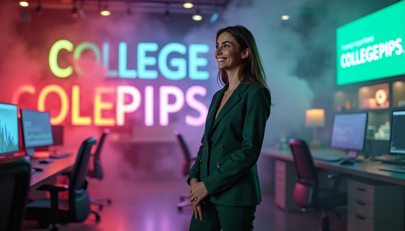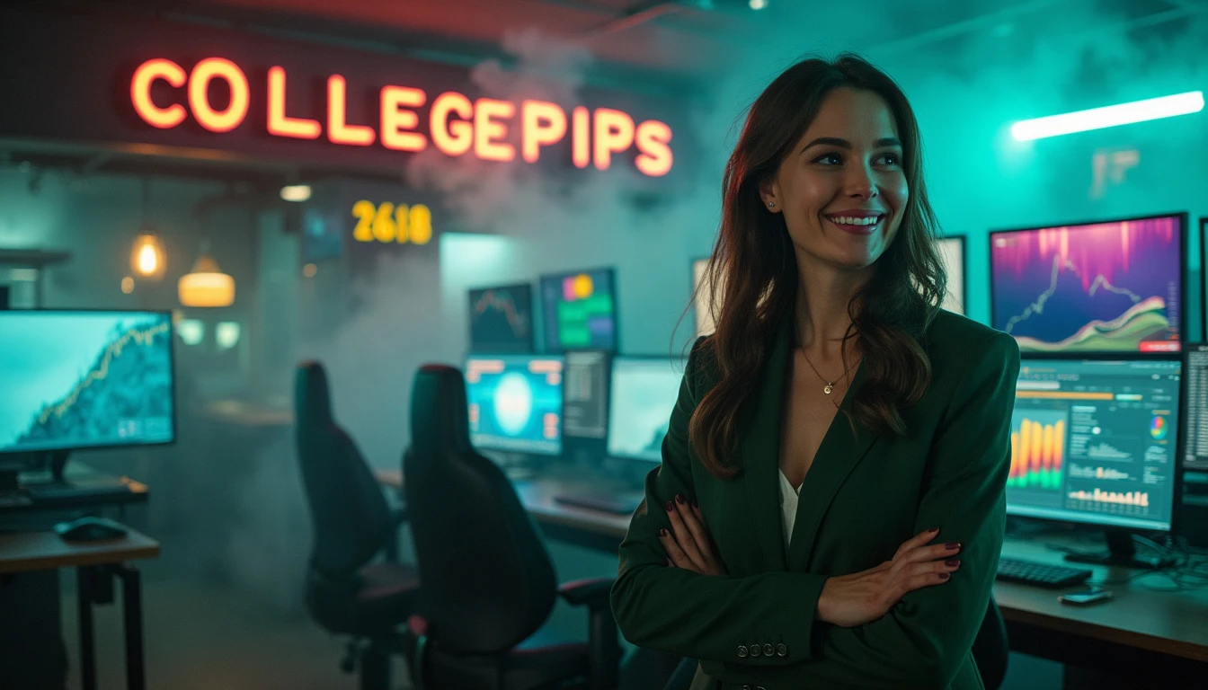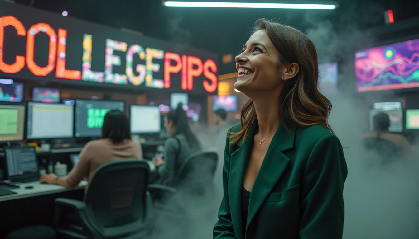 a woman wearing a dark green suit, smiling happily, full body, looking to the side at a large phrase written "COLLEGEPIPS", colorful letters, in the background a room with several colorful monitors and cryptocurrency graphics, an environment with lots of fog and smoke, ultra realistic image