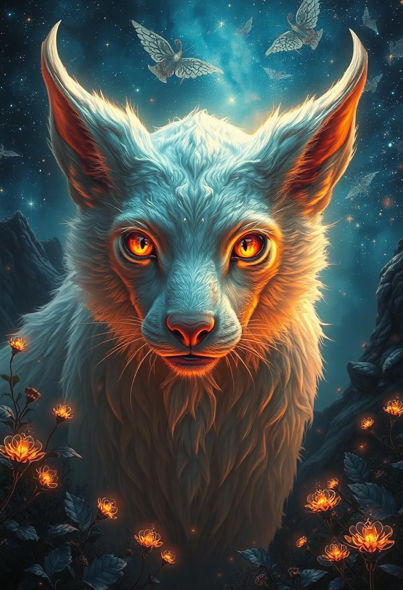 Art by Cameron Gray, Luis Royo, Charlie Bowater, a Beautiful Magic Animal, beautiful eyes, starry sky, extremly sparkling fantasy landscape at night, sparkling starry night, fantasycore, bioilluminated plants, intricate, hyperdetailed, hyperrealistic masterpiece, great depth, ultra highly detailed, detailed, digital painting, highly detailed, intricated, intricated pose, clarity, high quality, (Masterpiece:2)