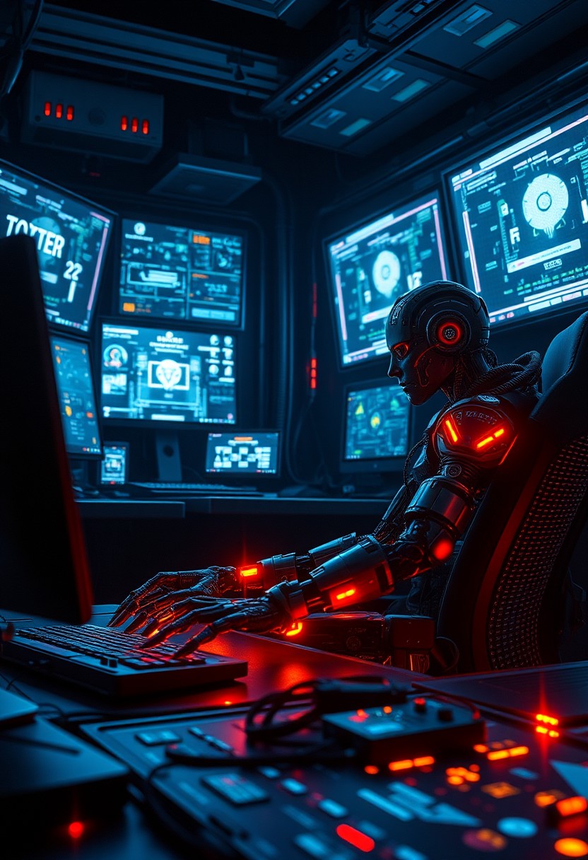 A cyberpunk cyborg hacker sitting in a dark, high-tech room filled with screens and holographic interfaces. The cyborg's fingers are equipped with data jacks and glowing cybernetic enhancements, working on a complex digital heist. The room is illuminated by the glow of multiple monitors