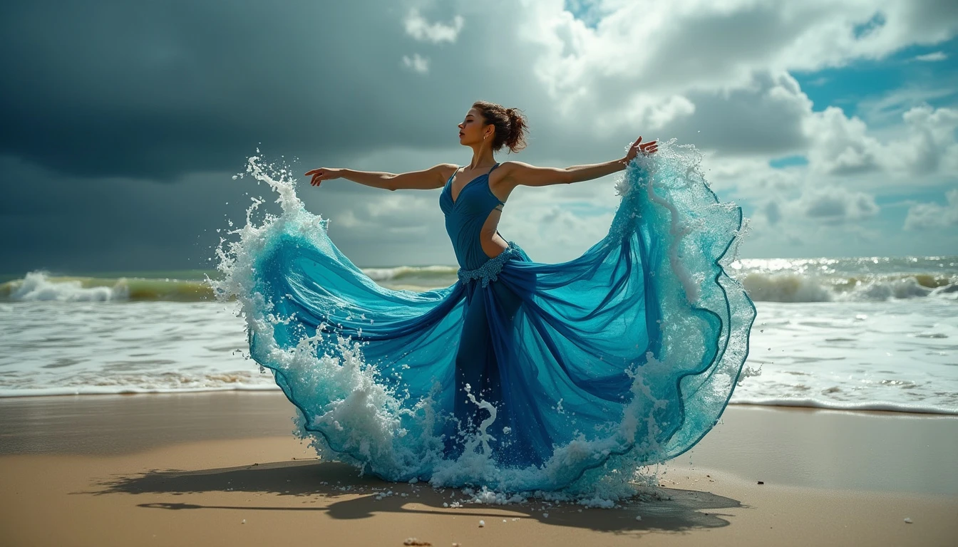 A dancer gracefully poses on a sandy beach, her dress transforming into a vibrant, swirling ocean wave. The wave is richly detailed with blue hues, adorned with marine life. In the background, dark clouds contrast against a bright sky, while the shore meets the gentle rolling waves. The scene evokes a sense of movement and harmony between nature and dance.