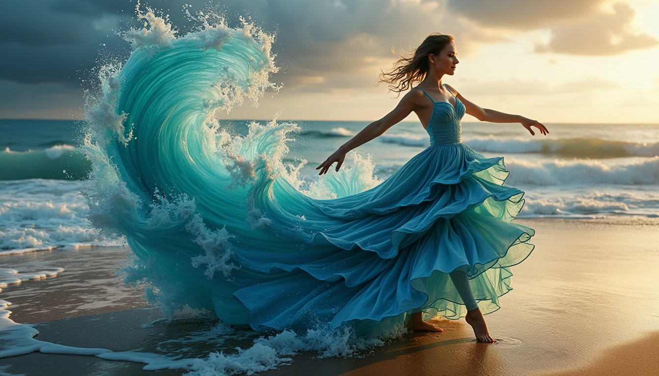 Dancer on sandy beach, dress transforming into vibrant ocean wave. Richly detailed wave in blue hues, adorned with marine life. Dark clouds contrast bright sky background. Shore meets gentle rolling waves. Movement and harmony between nature and dance. Sharp focus on dancer and dress-wave. Soft focus on background. Dynamic pose captures fluidity. Intricate details in wave-dress transition. Photorealistic style with fantastical elements. Golden hour lighting enhances colors. Subtle spray and foam details. Seamless blend of human form and natural elements.