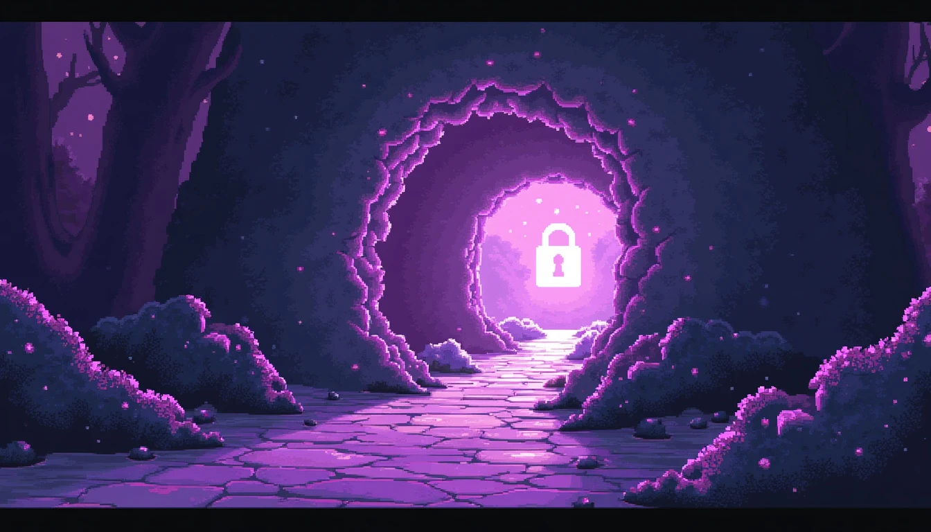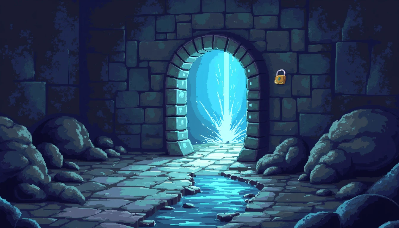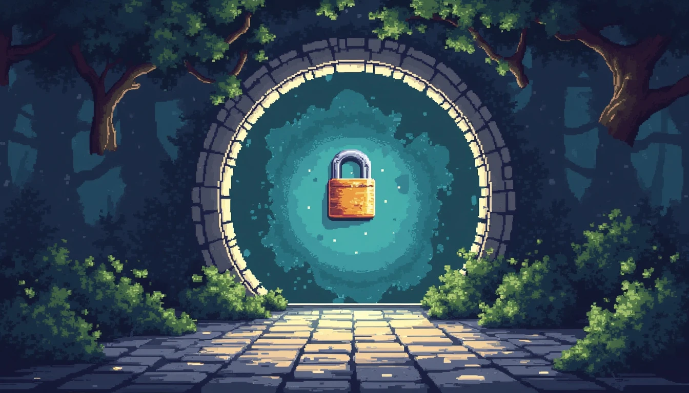 Create a pixel style image where there is a dimensional portal secured by a padlock