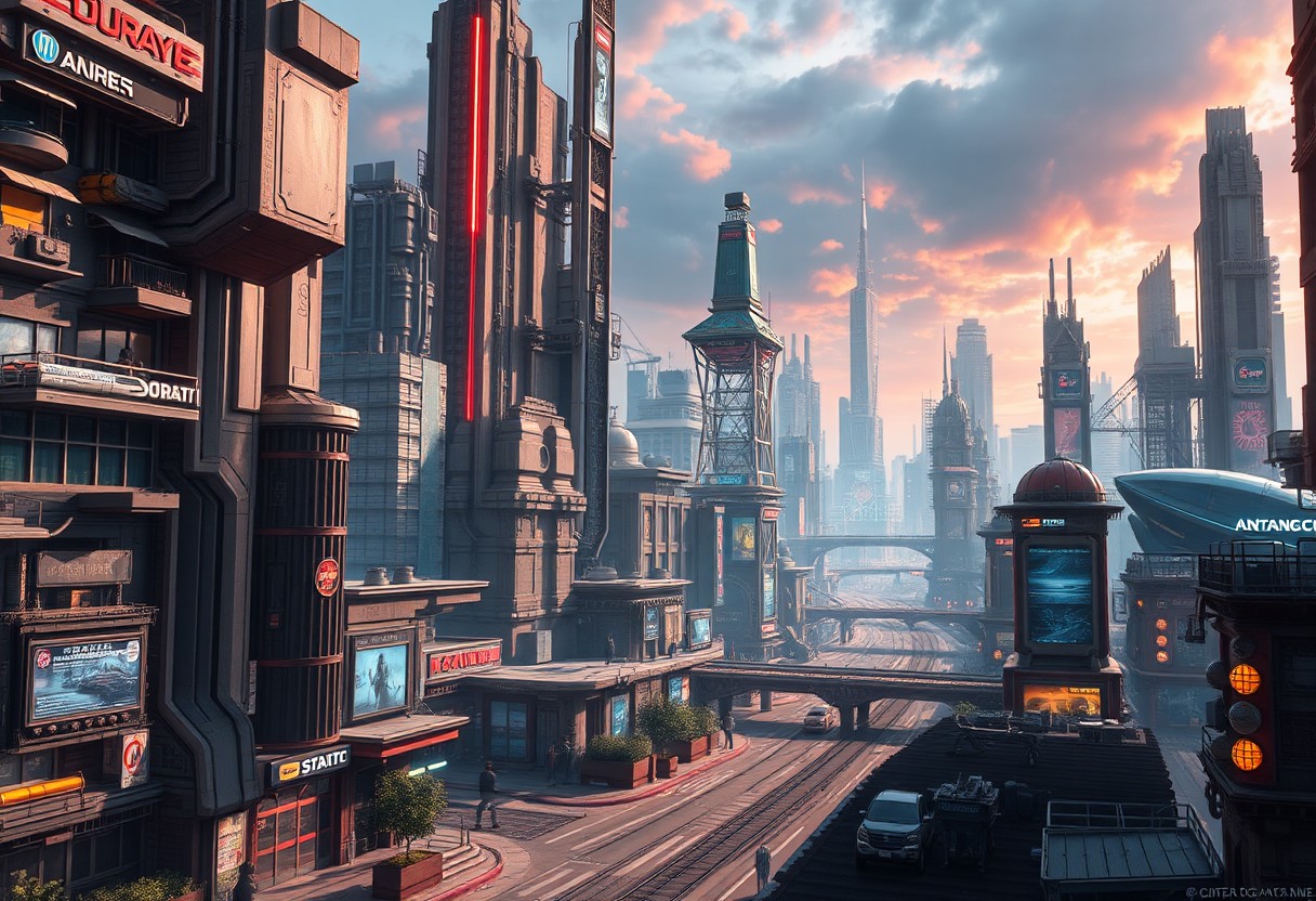 A highly detailed, photorealistic image of a near future cityscape, with a science fiction style