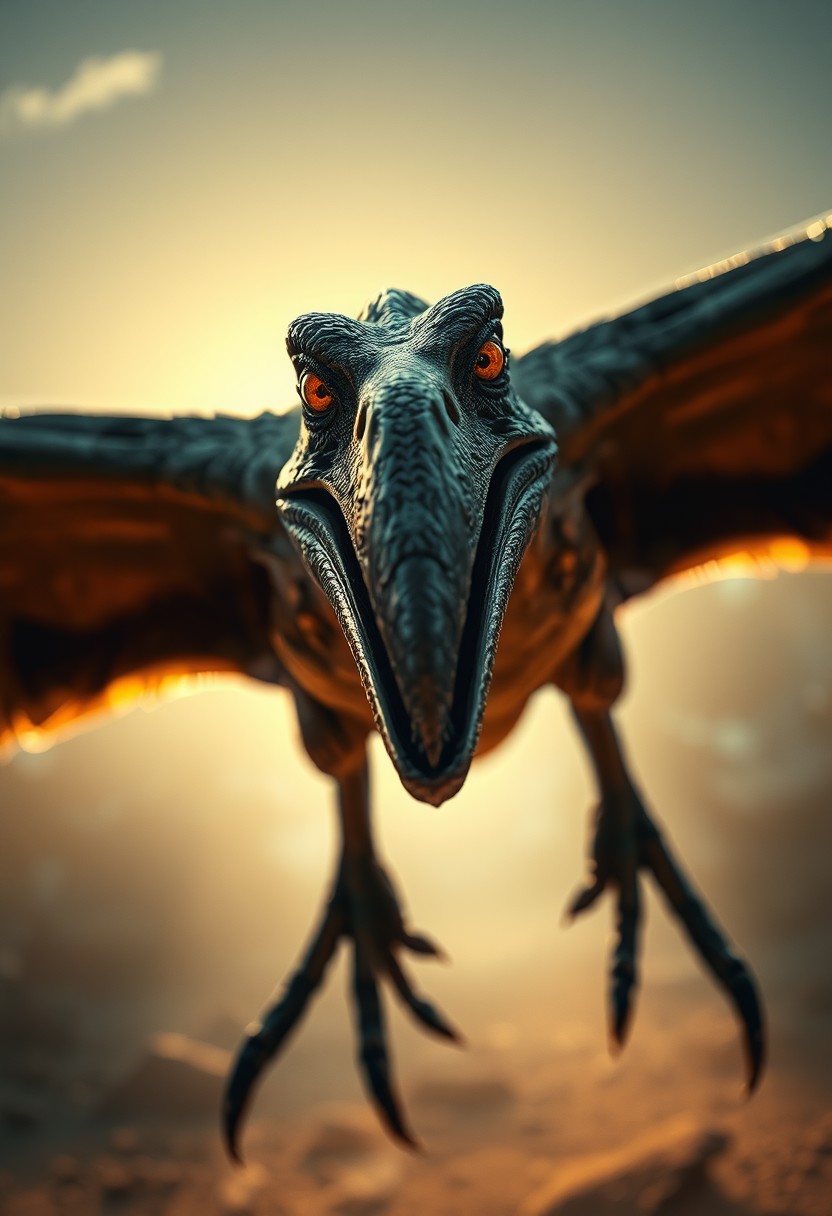 UHD dinosaur documentary movie still, photograph, Frightening scary aggressive pterodactyl with long bird-like beak and bright eyes diving towards viewer with wings spread and two feet with sharp talons reaching towards viewer, closeup, sun light shining from behind, horror, dark fantasy, photorealistic, photorealism, insanely detailed, sharp, 8k, masterpiece, trending on art station