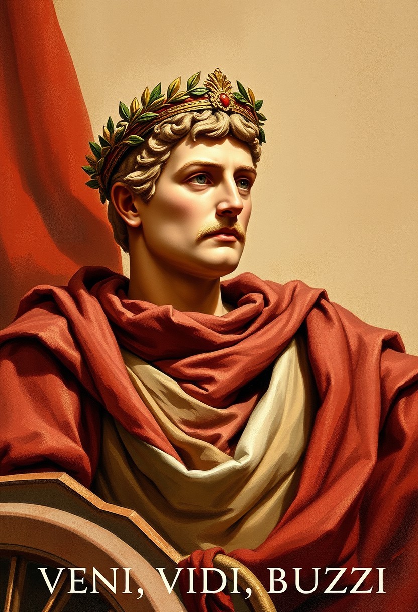 A portrait of Julius Caesar as victorious Roman Emperor on a chariot, laurel crown, title: "Veni, Vidi, Buzzi"