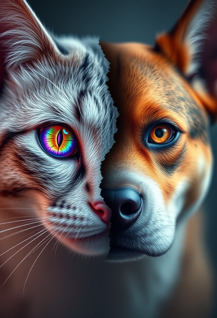 Create a photorealistic image of two half-faces that fit together perfectly to form the yin-Yang symbol. One half-face is a cat, with a vibrant, shattered eye that radiates colorful, swirling patterns like a kaleidoscope. The other half-face is a dog, with an equally vibrant, shattered eye that mirrors the cat's in shape and color. The faces are rendered in exquisite detail, with subtle texture and expression. The cat's face is serene and calm, while the dog's face is slightly more energetic and playful. The two faces fit together like an organic puzzle piece, with no visible seams or edges. The overall effect is one of mesmerizing, symmetrical harmony, as if the two faces are a single, unified entity. Highest-Quality, 4k, intricate details, visually stunning, Masterpiece