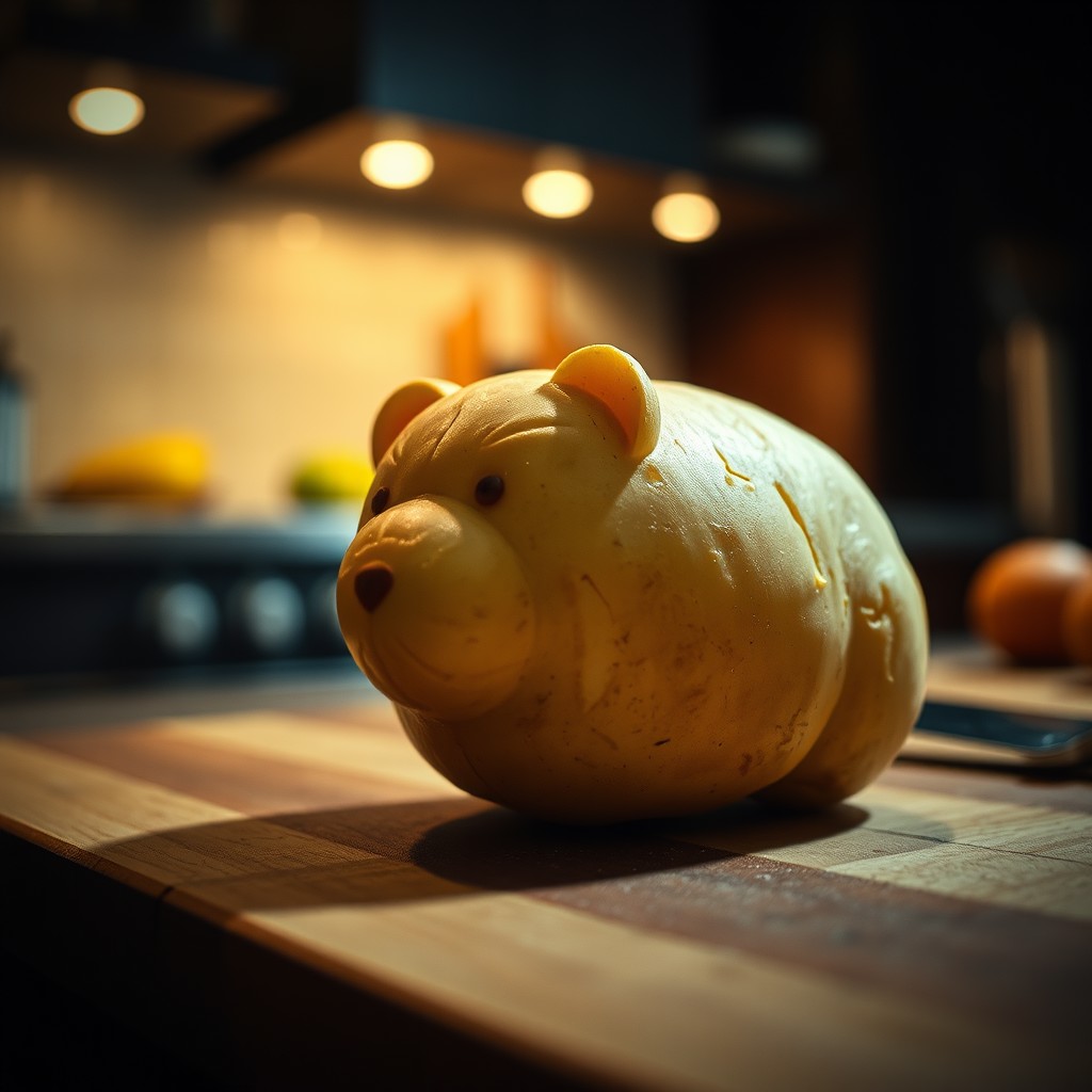 Closeup of a bear shaped potato on a wooden cutting board in a high end kitchen. focusing on dramatic lighting and contrasting colors, cinematic, film still, dramatic, moody, epic, gorgeous, film grain, grainy