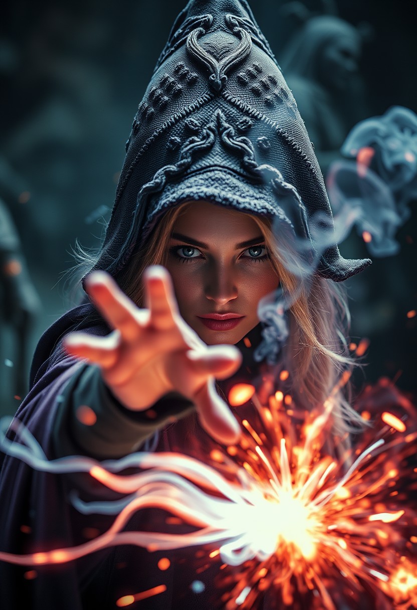 fantasy movie still, HDR, RAW. Photography. MAGICpunk battle and female wizard casting spell and magic vortex, fantasy world, Stunning visuals, Texture, beautiful face features.