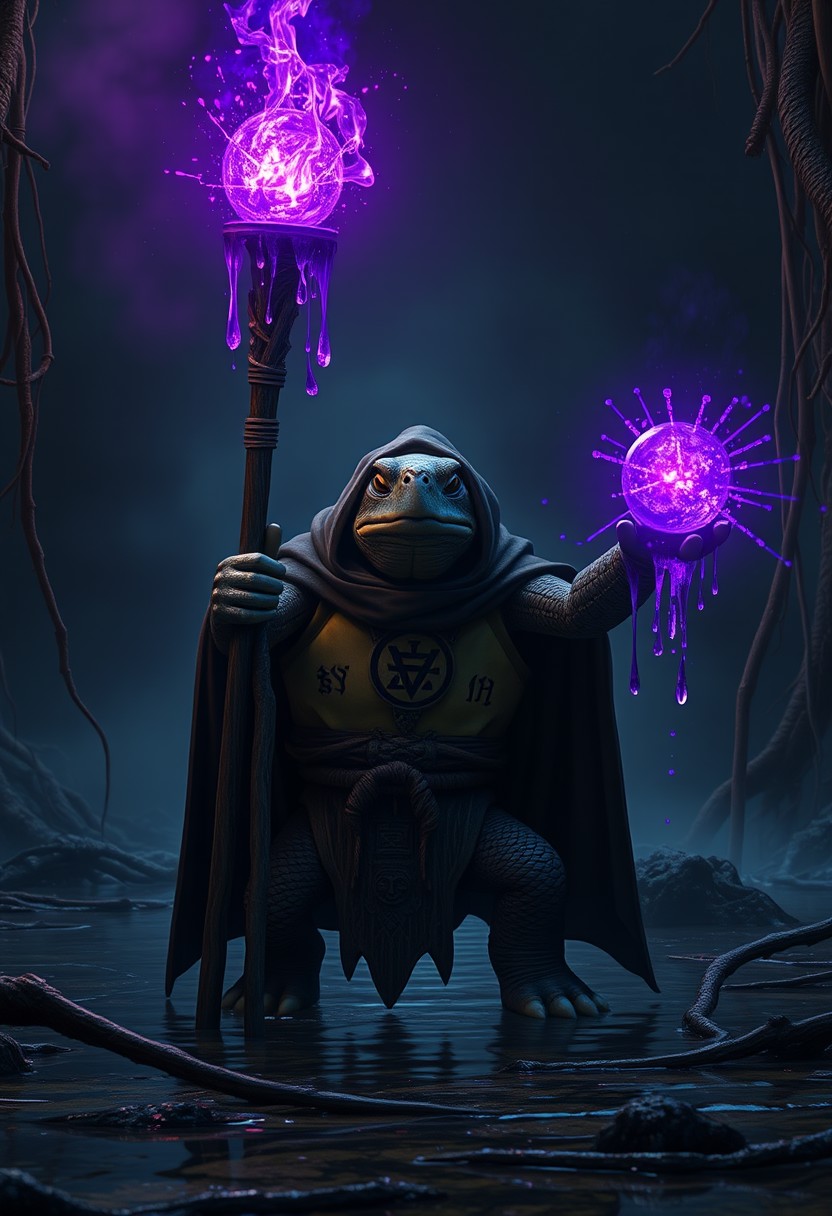 "Create a hyper-realistic image of a turtle shaman standing guard at the water gates of a holy sanctuary in the swamp. The shaman wears a dark, hooded robe enchanted with mysterious symbols, and holds a staff with a glowing purple magic jewel on top. The jewel pulses with a bright purple holy light, enveloped with a powerful dripping toxic ball that blasts outward at incredible speeds. The turtle's eyes glow with an inner intensity, ready to defend the gates against all threats. The swampy environment is dark and foreboding, with twisted roots and mist-shrouded waters. The atmosphere is ominous and foreboding, with a sense of ancient, primal power." Octane render, Highest-Quality, 8 k, intricate details, visually stunning, Masterpiece
