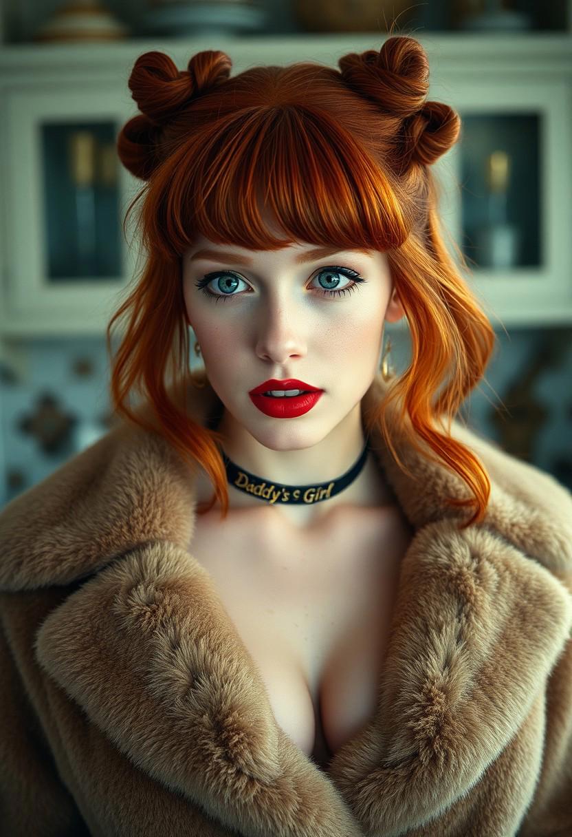35mm photo of 20 year old Christina Hendricks, breathtaking, (dramatic composition), close up shot. She is very tall and has a voluptuous figure with red-burgundy pronounced lips, duck lips, red hair, swept bangs, freckles, large round breasts, beautiful face, blue eyes, cute face, shy, light makeup, horny, sagging breasts, only wearing a mink coat and stockings, twin hair bun, choker that says “Daddy’s Girl”, sweaty skin. The background is very detailed, victorian kitchen, volumetric lighting, vivid colors