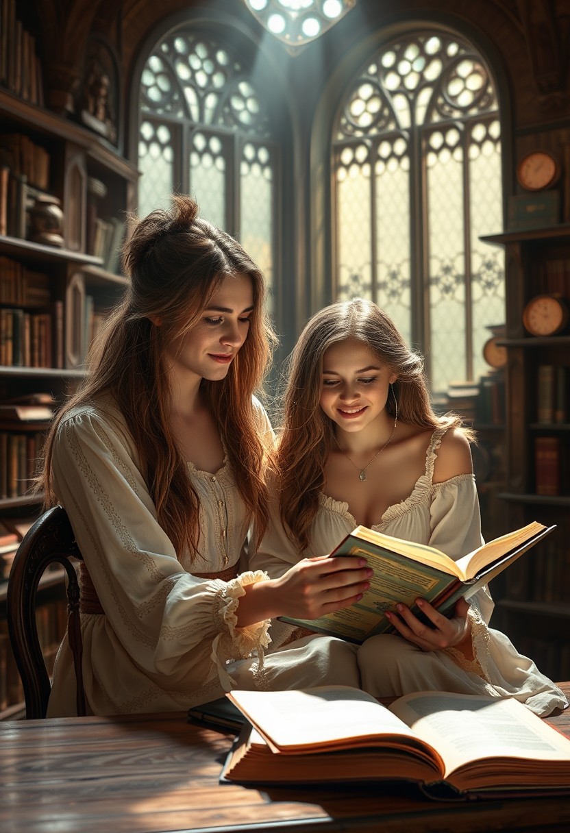 beautiful women with light brown hairs in light rustic fantasy dress seating on a table and reading magic spell book. Man with black short hair looking at her and smile. Man and women are in a magic huge ancient library, flying books with magic circles around, ray of light from huge windows. Picture is full of magic and romantic. High quality, super detailed face, long short, full body, focus on face