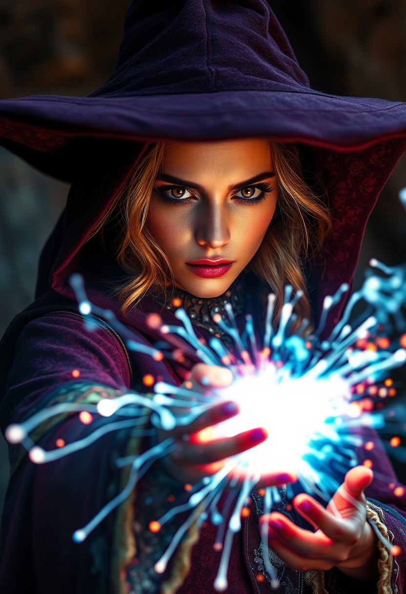 fantasy movie still, HDR, RAW. Photography. MAGICpunk battle and female wizard casting spell and magic vortex, fantasy world, Stunning visuals, Texture, beautiful face features.