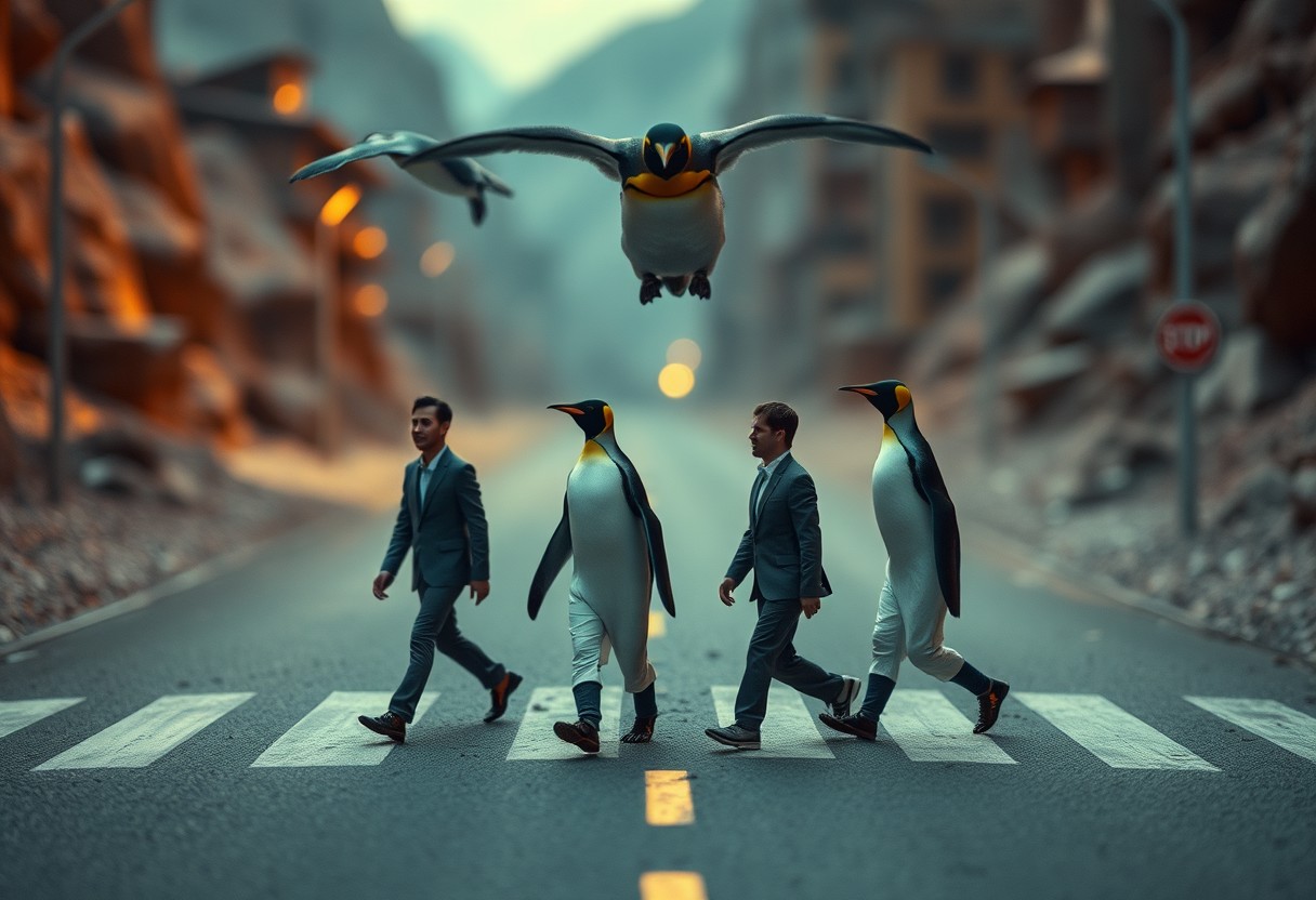 very unrealistic, ultra surreal, psychedelic, ambient light, diorama, four man walking, four man cross the road, close-up medium shot, close-up, analogy photo, cyberpunk, wasteland, huge penguin fly under them