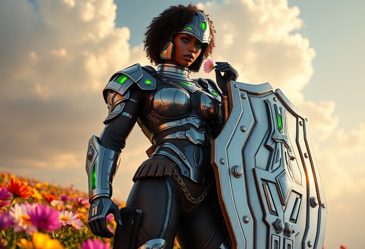 Videogame unreal engine 4 render image of a tall large bodybuilding buff muscular sexy hot black female soldier from the year 2150, cool sexy futuristic military character design, she has short curly hair, green eyes, green lipstick, she is tall and large and has huge breasts and muscles, she is wearing full body chrome military armor that's inspired by gladiators from Rome, including a roman gladiator helmet with a green transparent eye visor, the armor is chrome eith green LED embedded in it, her chrome armor is showing signs of damage and degradation, bullet marks, scratches amd grime, she is also wearing brown military and ammo pouches on her legs and belt, she is standing in a field of colorful flower, holding a smelling a flower in her right hand, she has is a large chrome shield with LED green lights attached to her left arm, bullet belt, vast sky, majestic clouds, warm sunlight, cozy, epic pose.