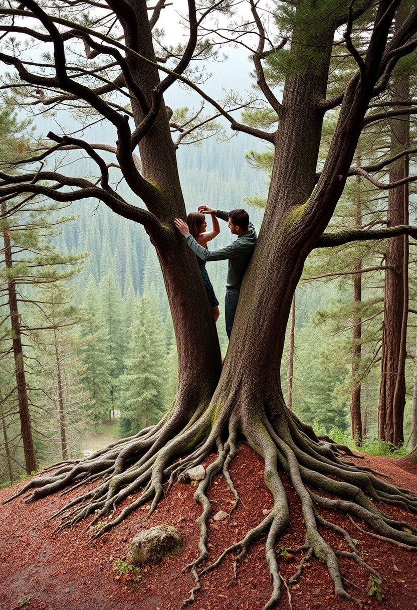 film stock nature photography, two trees dancing in a forest, their roots and branches resemble limbs, their positions look like that of tango dancers, bodies really close. On top of a mountain in the middle of a prime forest.