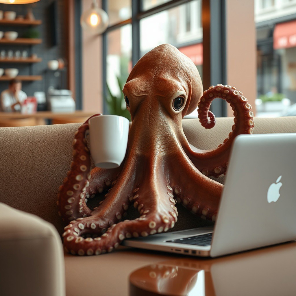 a very detailed close picture of an octopus siting on a sofa ina coffe store and working on a macbook while drinking a cofee