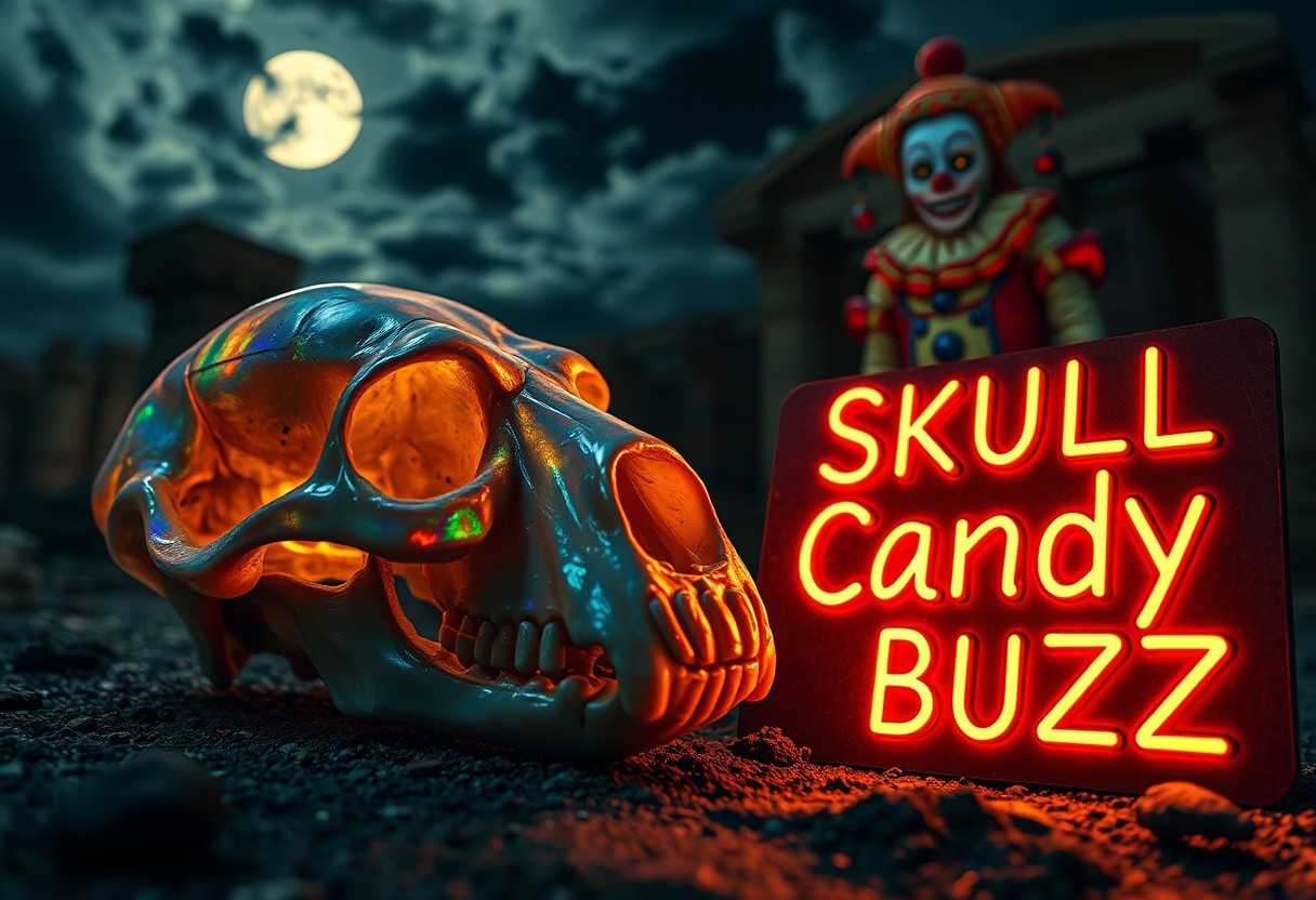 A close-up macro shot of a dog skull crafted from opal, resting within the ruins of an ancient Egyptian temple. The skull reflects a mystical iridescence with intricate details, while the setting exudes an eerie atmosphere. The scene is dimly lit by moonlight, partially obscured by thick clouds, casting shadows over the ruins. In the background, a terrifying clown stands clearly visible, dressed in tattered, colorful clothing with a menacing grin, pale face, and dark eyes glowing under the moonlight. Its unsettling presence dominates the scene. Nearby, a stylish, refined cardboard sign reads ‘Skull Candy Buzz’ in glowing orange fluorescent letters. The sign’s cool and fancy design contrasts sharply with the dark, creepy environment