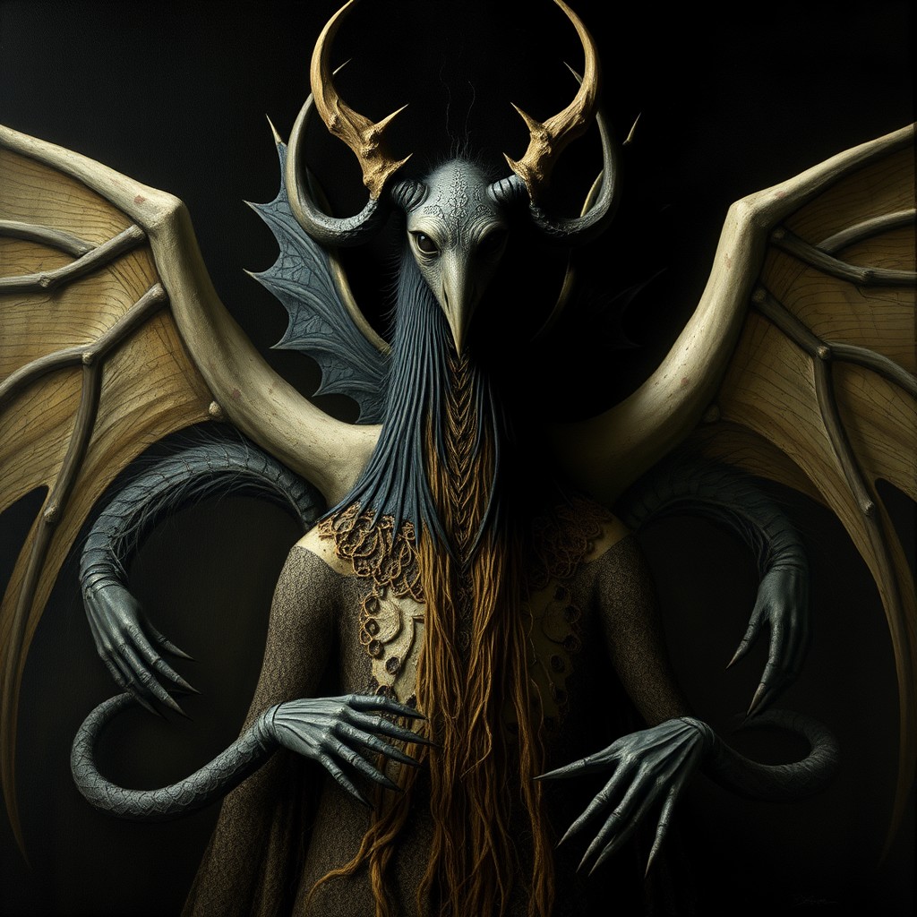 style of Leonora Carrington, surreal, dreamlike, creatures, symbolism, subconscious, human condition, (dark, mysterious, (intricate details), dramatic lighting, (symbolic)), ethereal, (surrealism, HD, close-up, (fantasy), abstract, (dark fantasy), mythology, (horror, (nightmare)))