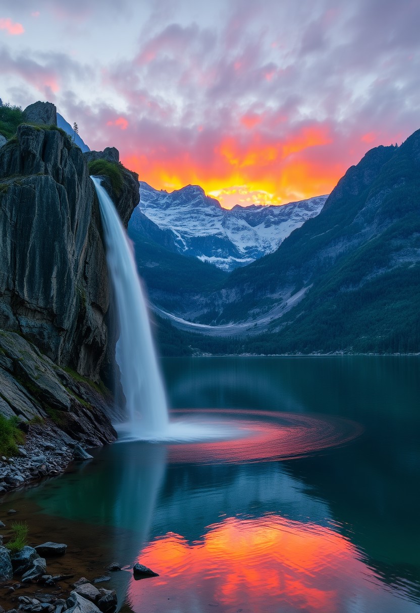 A breathtaking waterfall cascading from a rugged cliff into a serene lake, surrounded by majestic mountains, vibrant sunset colors reflecting in the water, ethereal atmosphere, high detail, soft lighting