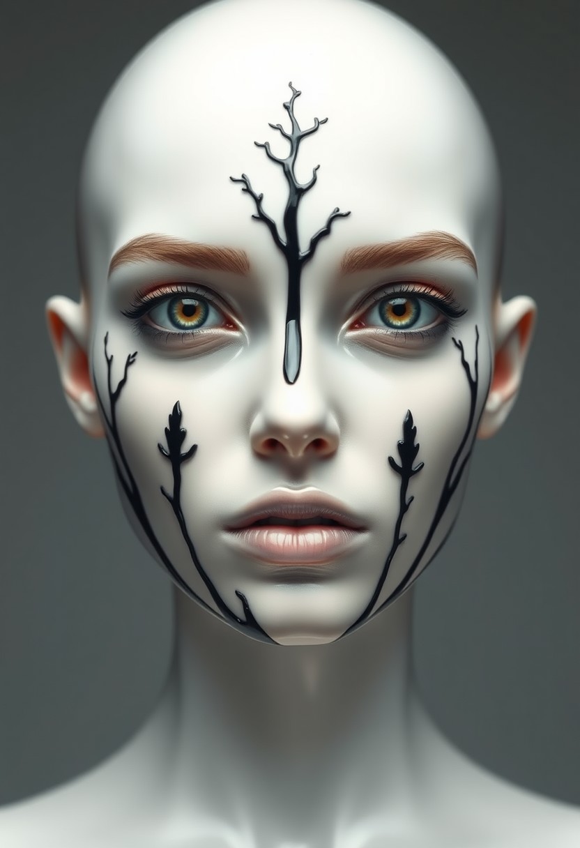 The highest artistic achievement, modern simplicity, futurism, visual impact, stunning image, simple image, coordinated colors, front view, bright lighting, surrealism, fantasy world, fantasy style, artistic close-up of a female supermodel in glossy ceramic material, no makeup, bald, deep eyes, perfectly symmetrical beautiful face, pushed out from silky black oil which creates a Forest treeline around the eyes, the black oil on the face creates a contrast with the delicate white ceramic. Highest-Quality, 4k, intricate details, visually stunning, Masterpiece