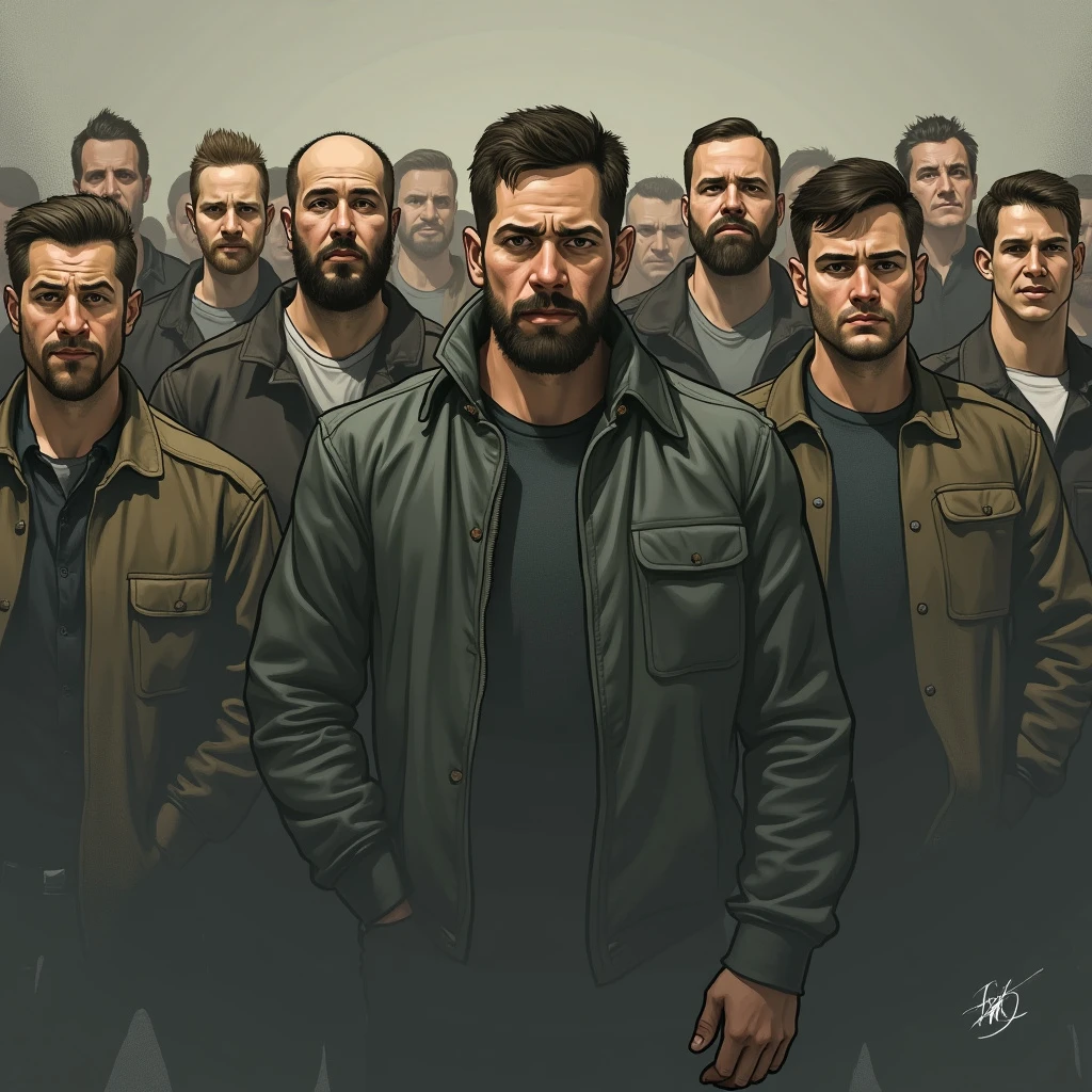 stylized illustration or digital painting in a semi-realistic style. It depicts a group of men standing in lines, The color palette is muted, with lots of earthy tones and a grayish background. The lighting creates dramatic shadows on the men's faces, The style of the artwork is reminiscent of video game or movie promotional art, with a gritty, somewhat realistic aesthetic but clearly stylized and enhanced for dramatic effect.