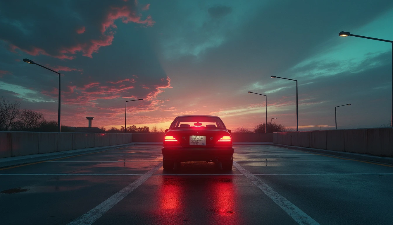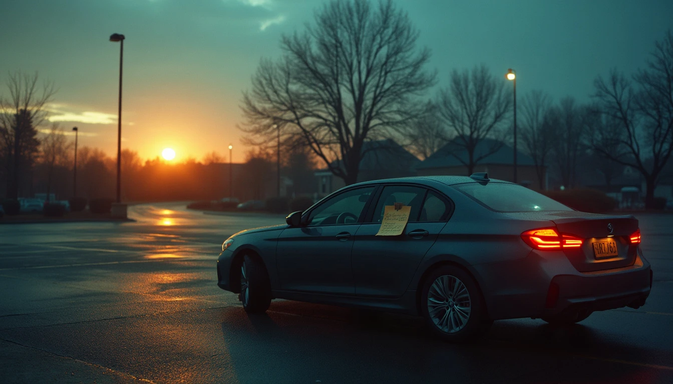 A surreal parking lot at dawn, a lone car with a note card taped to the steering wheel glowing with mystical light, surrounded by whispers of wisdom in the air. hyper realistic