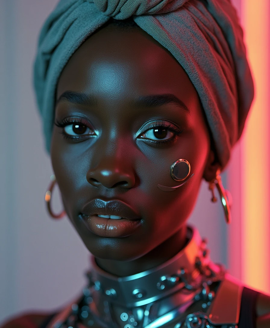 Very dark skin cybernetic woman with oval face and pointed chin, almond-shaped upturned eyes, serene expression, slender slight-sloped nose, slightly parted full lips, wearing exotic turban, posed in vaporwave style, mechanical body parts, digital photography, aesthetically nostalgic, Polar, iridescent