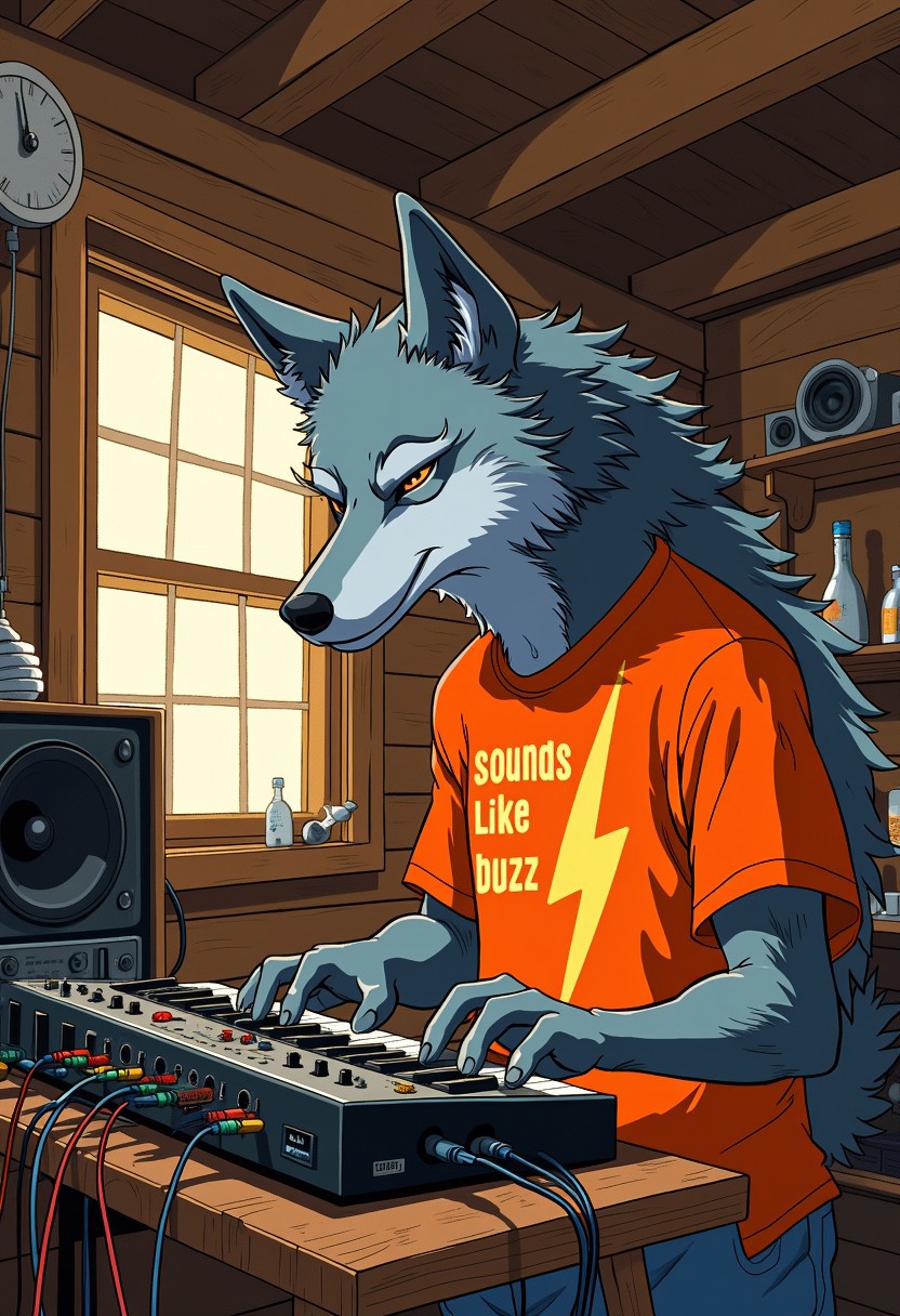 An anthro gray wolf musician is arranging cables on an analog synthesizer in a rural cabin studio, he's wearing an orange t-shirt with text "sounds like buzz" under a yellow lightning bolt symbol, dynamic, portrait, anime style oil painting