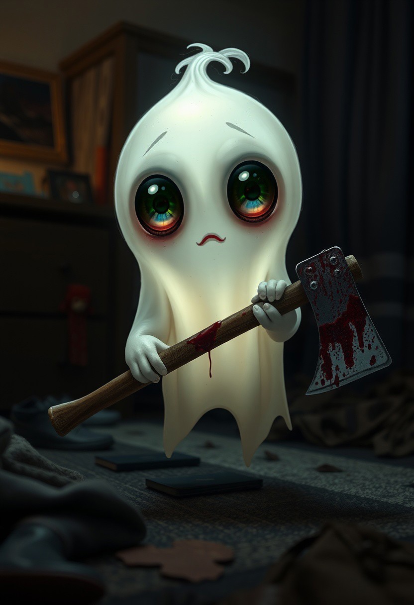 cute adorable, ghost-like creature with large, expressive eyes that capture a sense of wonder and curiosity. The creature's should be soft and illuminate , with shades of white that blend seamlessly with its dark surroundings. It is carrying an bloody axe in a teenager room