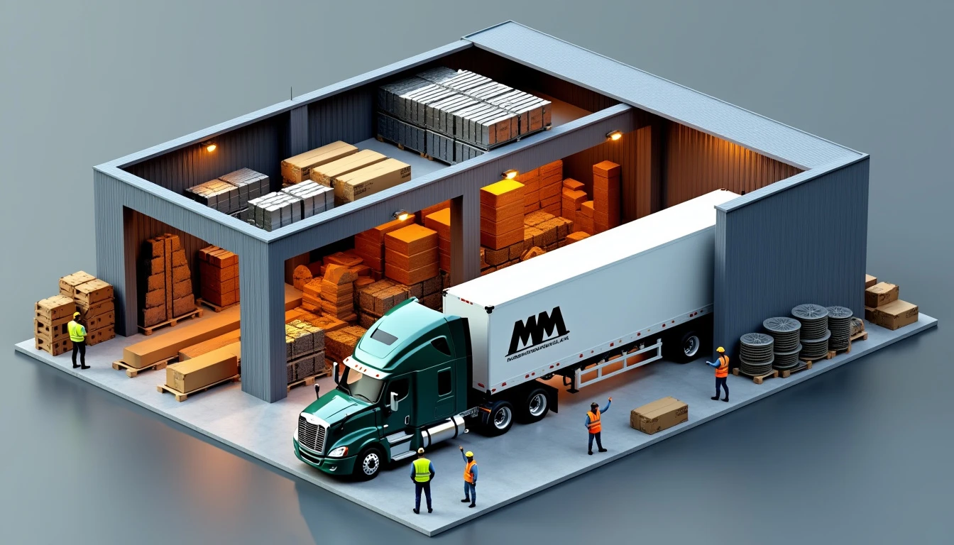 A highly detailed 3D render, isometric view, hyper realistic, high detail, behance, huge scale commercial operations box with blank background. Modern and expensive huge scale commercial activity. Different levels of the building showing different processes - Steel production, Steel packaging, Steel shipping. Inside the box, we have shiny metallic steel products like bars, billets and wires, steel sheets stored properly and looking expensive. Show lots of steel products. Make the steel products look very detailed. Have lots of steel everywhere in the entire picture. A few dark green truck tractor in front with a white trailer in the back where cargo is stowed with black MM logo on it and the truck is being loaded by a man in safety vest and hat. Few men are inspecting the boxes with MM written on it that are being loaded onto it.