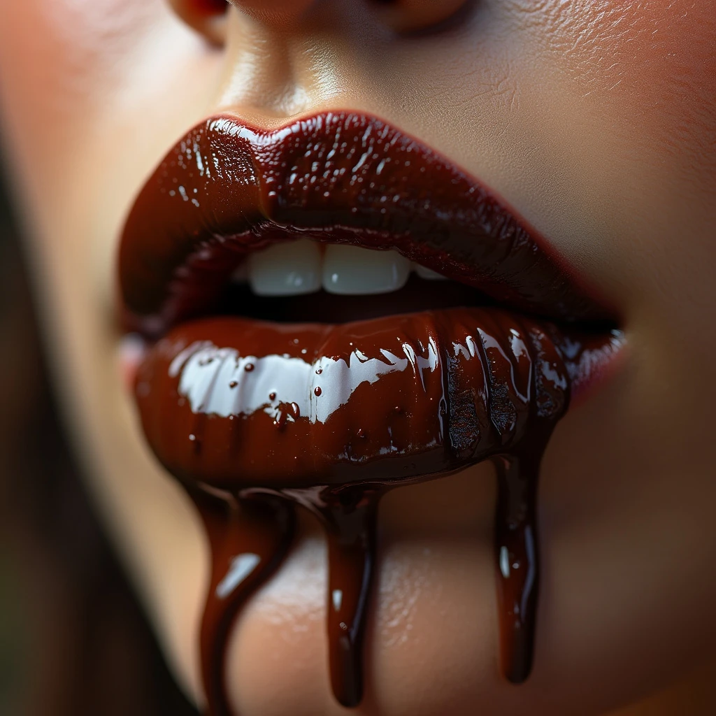 Ultra-realistic image: the skin of women's lips as dripping chocolate. The surface and structure of the lips look as if they were made of rich chocolate. The lips should have a texture that is as close as possible to the chocolate structure. The background should be that of a muddy environment