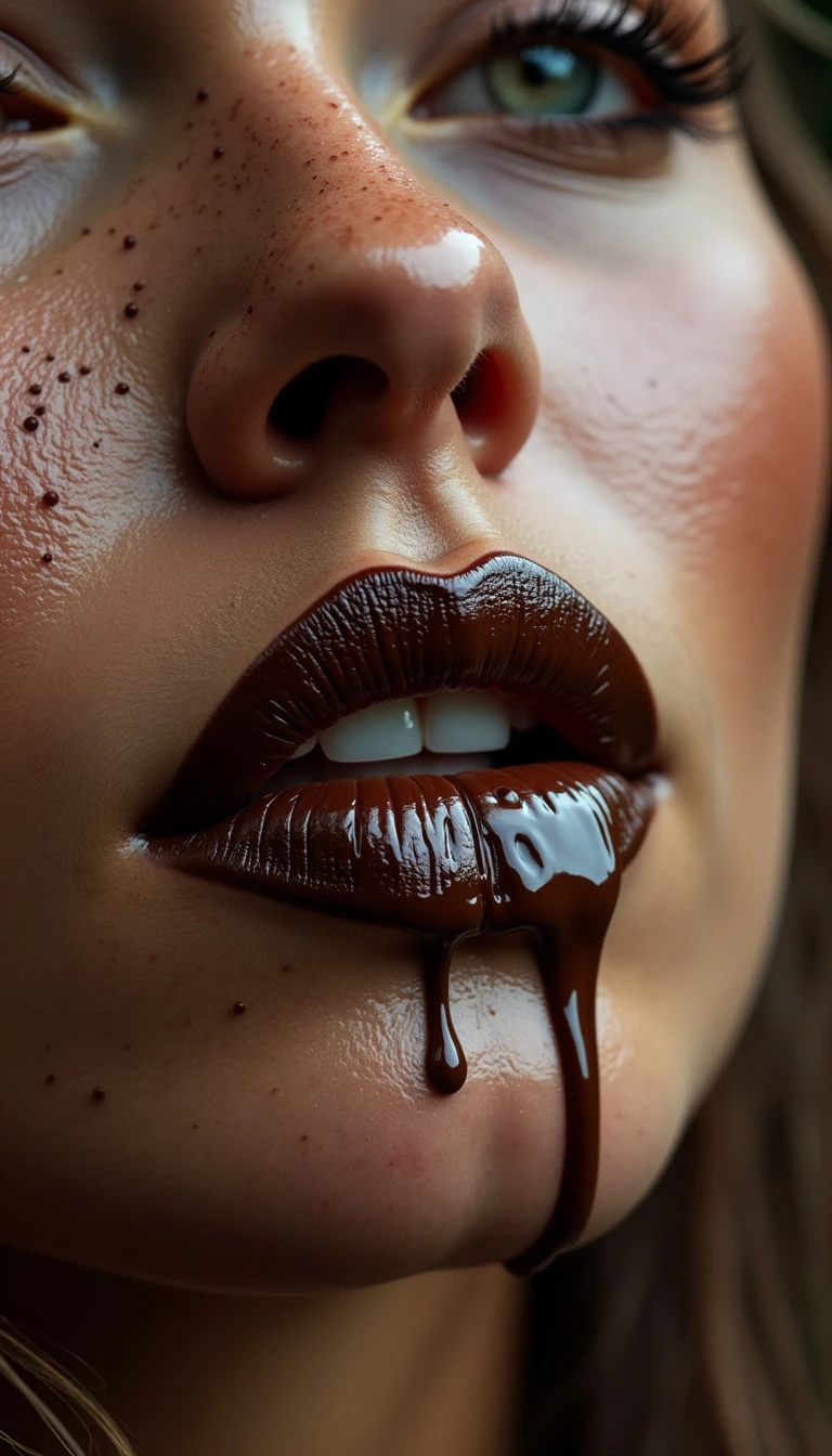 Ultra-realistic image: the skin of women's lips as dripping chocolate. The surface and structure of the lips look as if they were made of rich chocolate. The lips should have a texture that is as close as possible to the chocolate structure. The skin of the woman embodies that of dried mud. The background should be that of a muddy environment