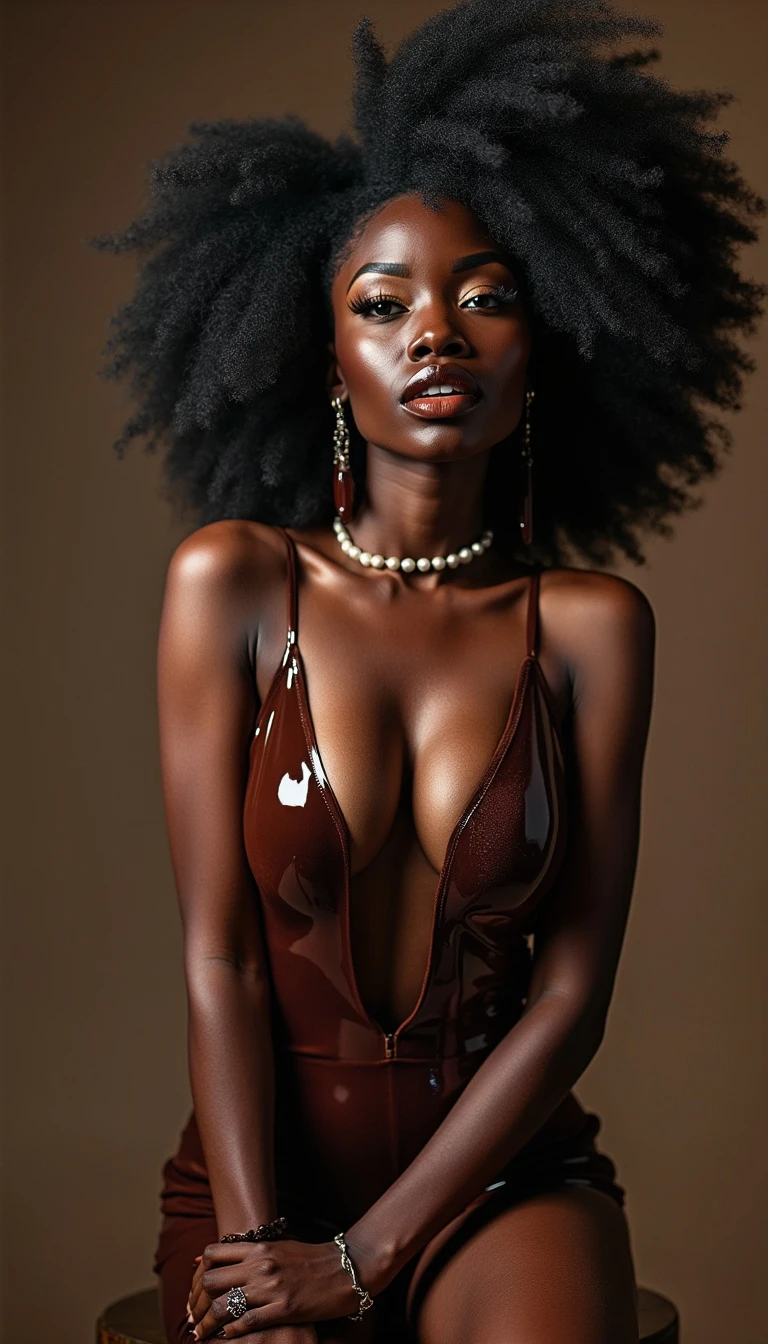 a dark skin afro woman made up of dripping chocolate and wearing a plunging neckline outfit in the style of Jay Anacleto