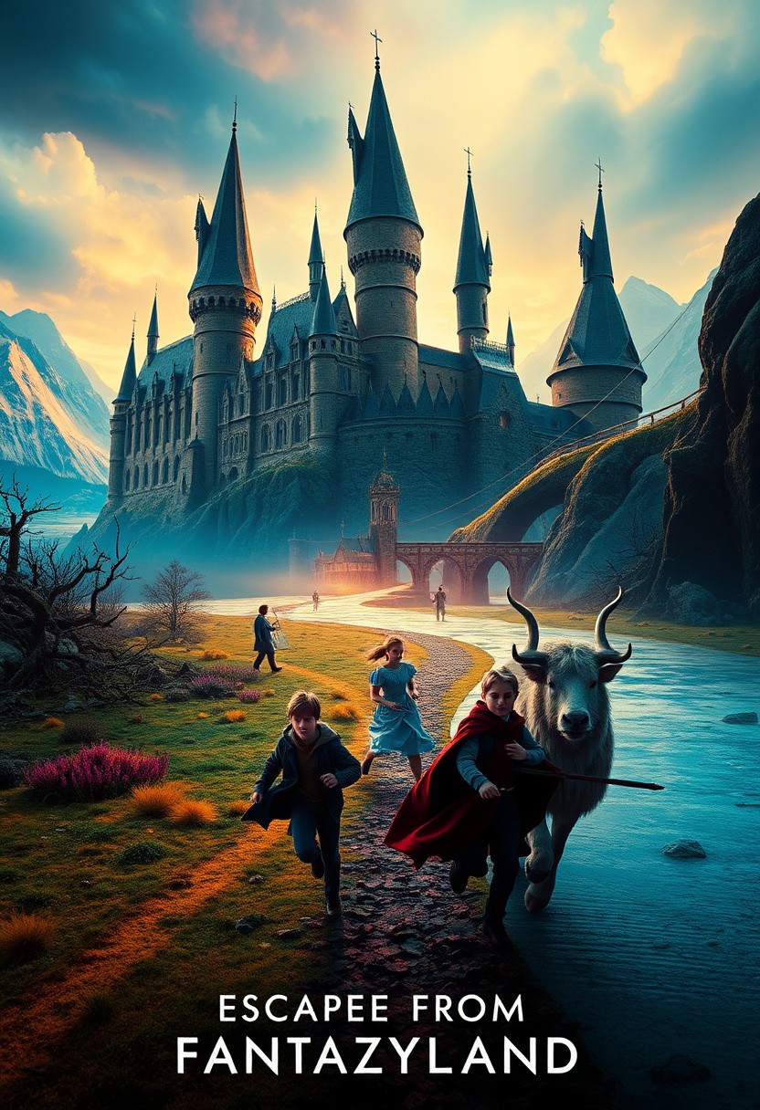 Movie Poster Concept: A surreal landscape where Hogwarts, the Queen of Hearts' castle, and Narnia's icy realm all blend together. Harry, Alice, and Aslan are running from an unknown threat that's altering their realities. Bright colors shift into dark hues as the lands overlap. "Escape from fantasyland"