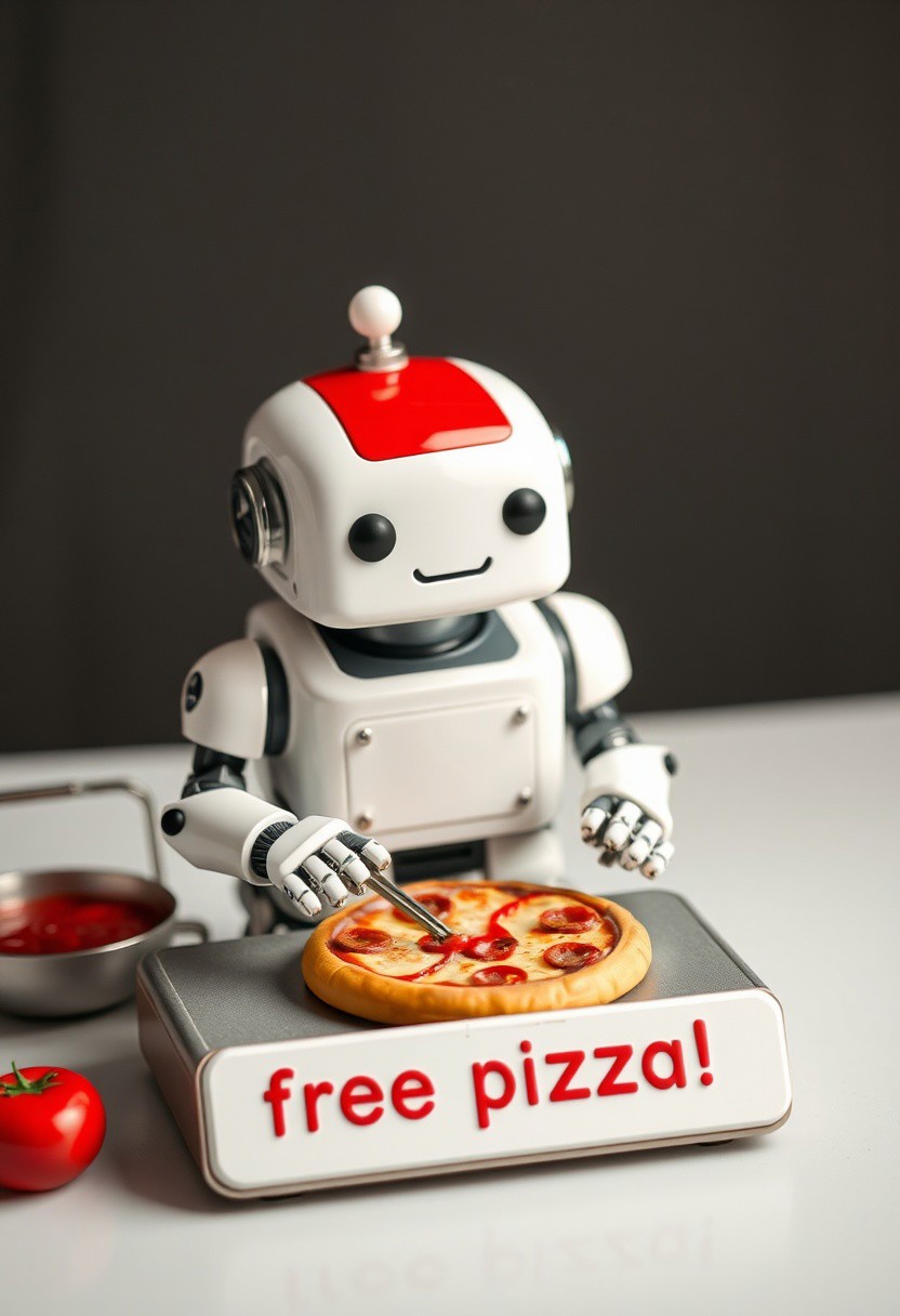 photo of a cute little robot cooking pizza, kawaii, inscription "free pizza!"