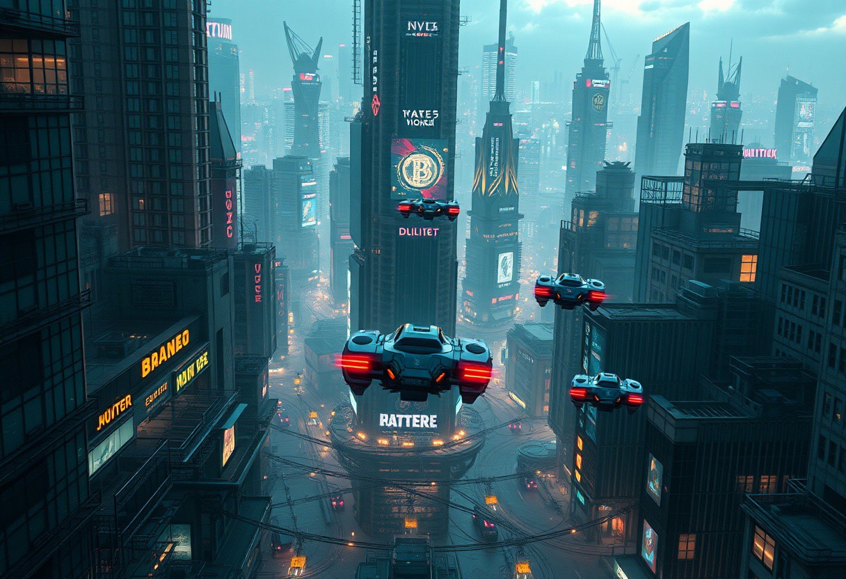 A highly detailed, photorealistic image of an urban cyberpunk style cityscape with flying cars