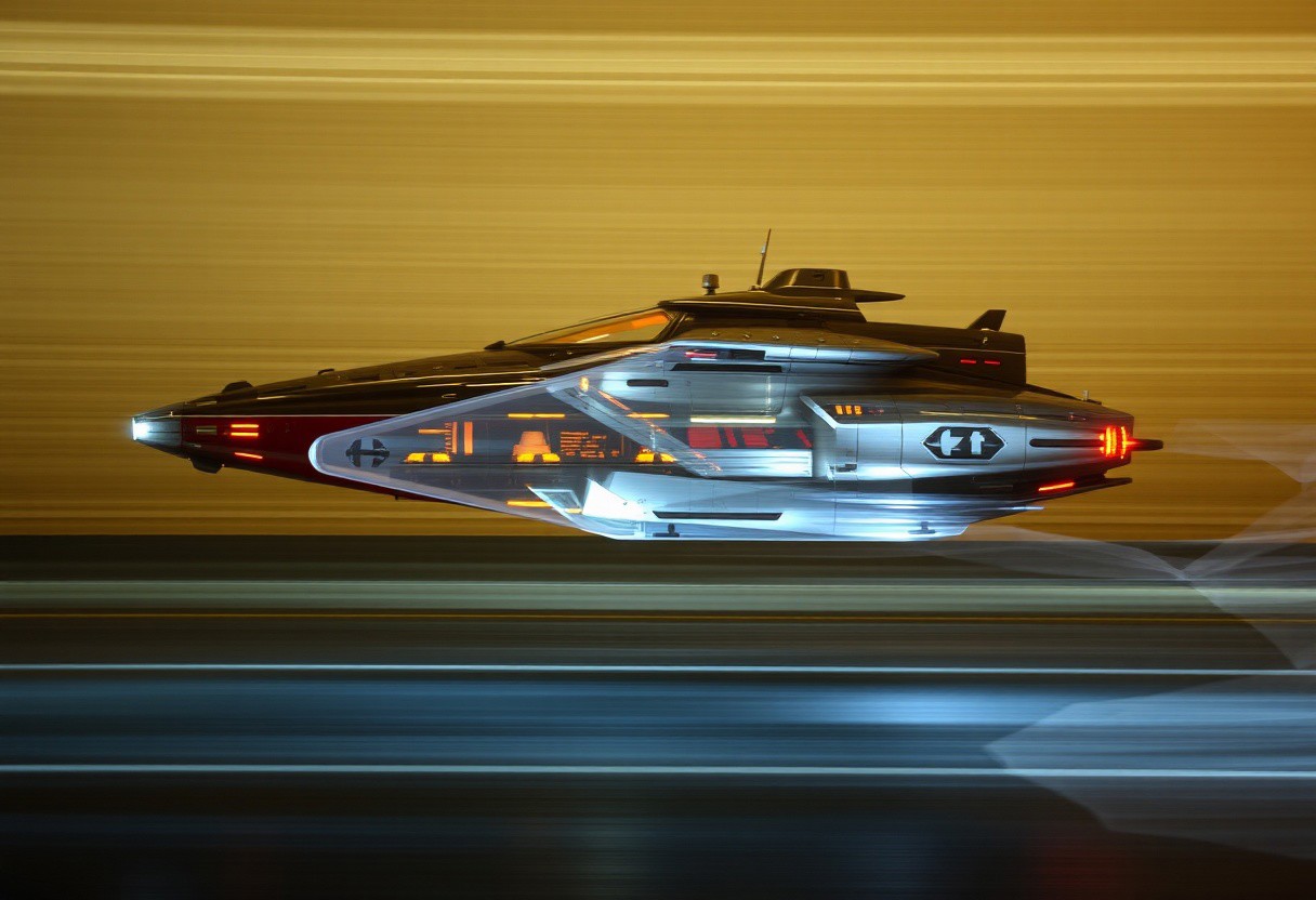 (Chronophotography) of a spaceship running, (multiple exposures of movement in a single frame, showing motion progression), overlapping transparent ghostly spaceship silhouettes, ghostly effect, motion blur