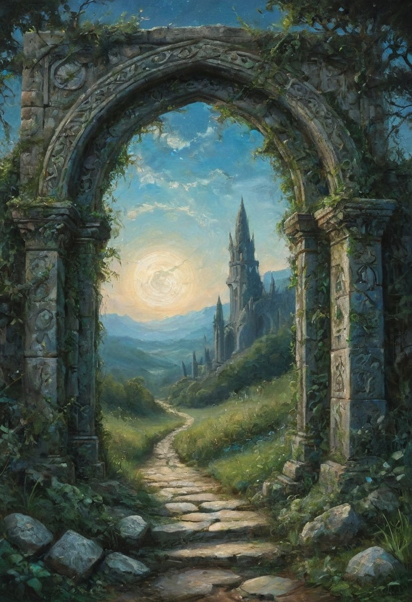 oil painting of an ornate gothic stone archway. The archway is adorned with ancient carvings and is partially covered with lush green foliage. The sky beyond the archway reveals a dark fantasy landscape with a blue moon. The ground is a mix of stone and grass. The overall composition is vibrant and fantastical, evoking a sense of adventure and wonder