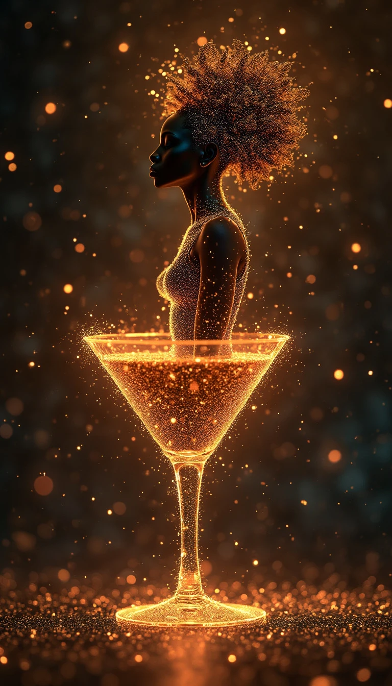 a majestic african goddess made entirely of stardust and celestial particles, her form shining like a supernova in the darkness, radiant aura of light and energy, sitting in a cosmic cocktail glass, captured in 8K with a slight emphasis on subtle texture and depth effects to add dimensionality.