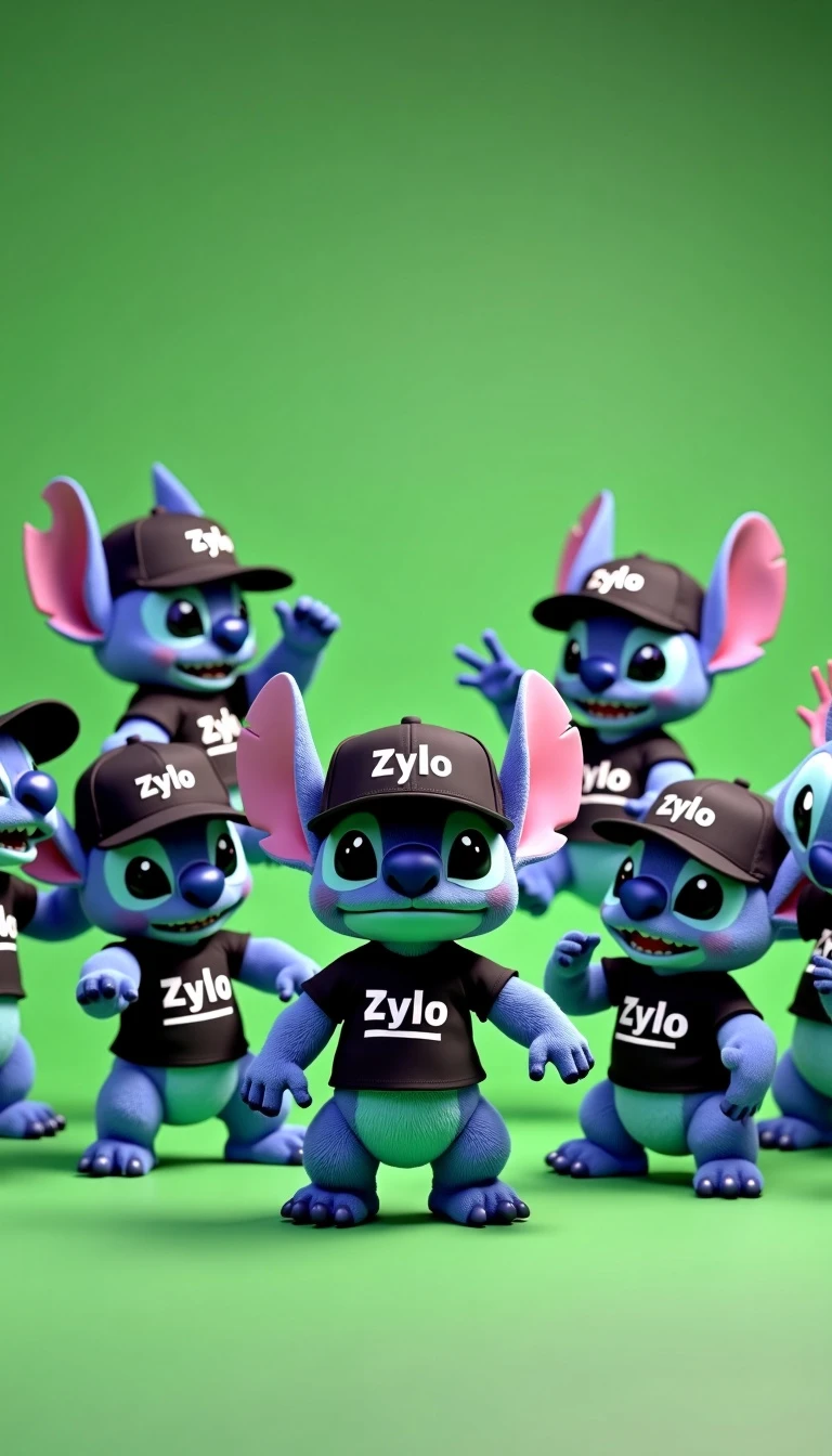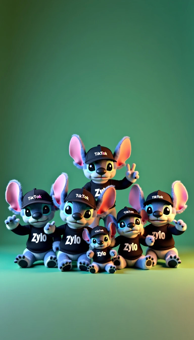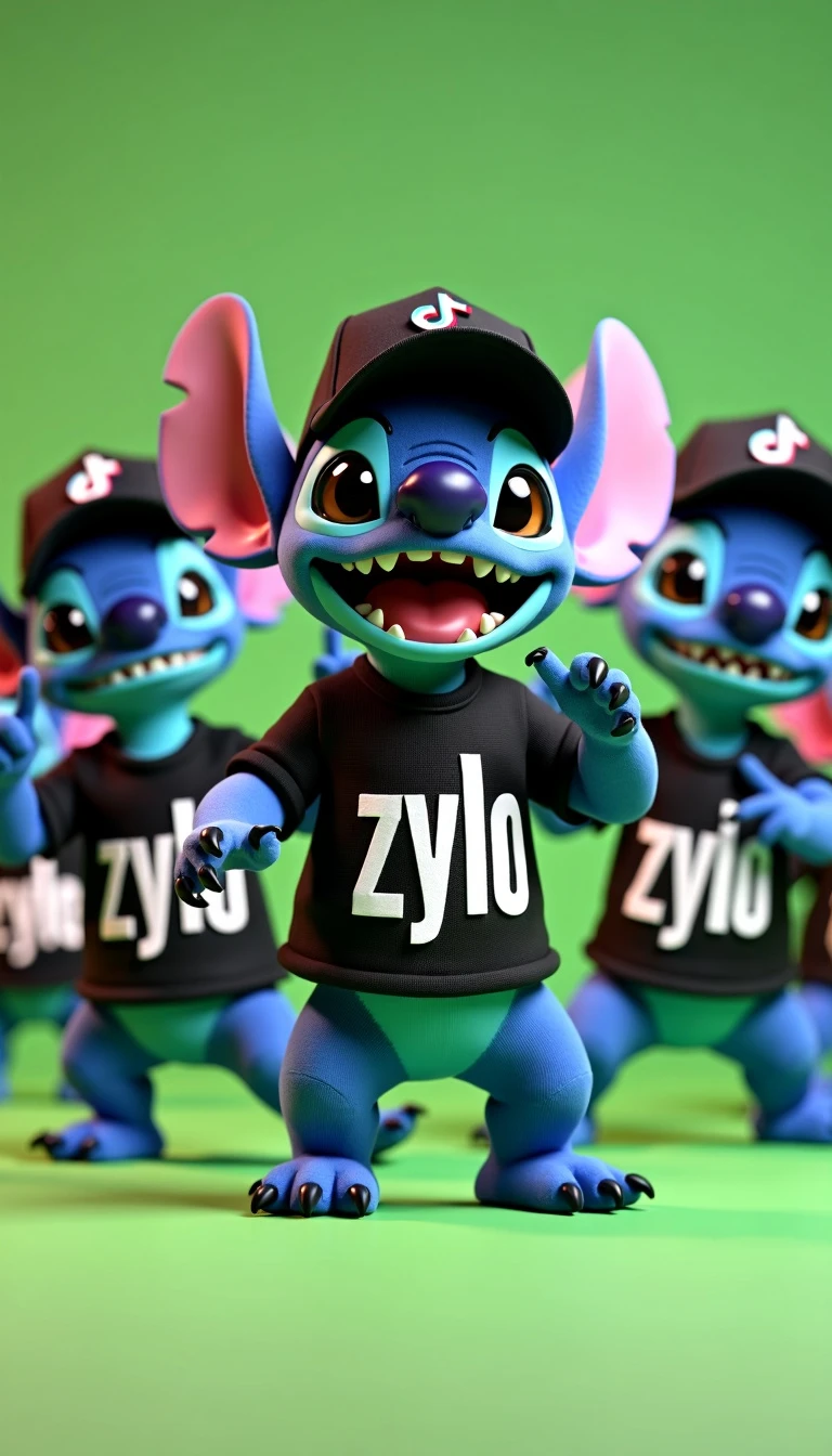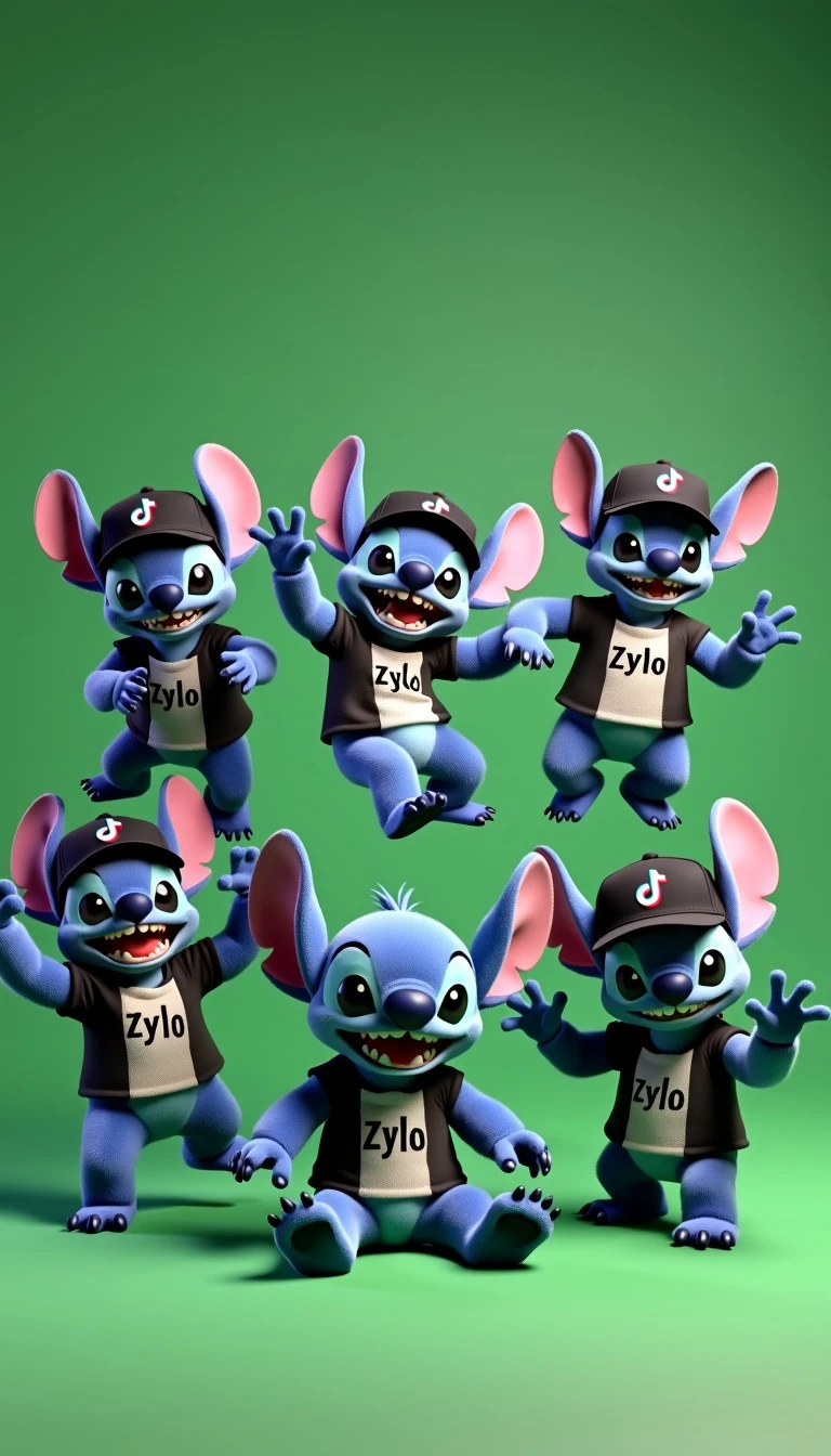 8K ultra-realistic wide-angle shot of seven 3D rendered Stitches in a photo session: Seven mischievous, furry Stitches are scattered throughout the shot, each in a unique pose, showcasing their playful personalities. Each Stitch is wearing a black trucker hat with the TikTok logo displayed on the front, along with stylish jumpers featuring large, bold "Zylo" letters. The lighting brings out every soft strand of fur, making them appear life-like, as if they exist in the real world. Each Stitch strikes a different pose: one is mid-jump, another flexes his muscles, one is sitting cross-legged, another waves at the camera, one does a peace sign, and two others pose like they’re in a dance-off. Their mischievous expressions vary, giving each Stitch a distinct character. The camera angle is set to f/18 with a wide-angle perspective, ensuring all seven Stitches are sharply detailed. Their paws, ears, and facial features are highly realistic and detailed. The entire scene is placed against a one-color green screen background for easy background changes during editing.
