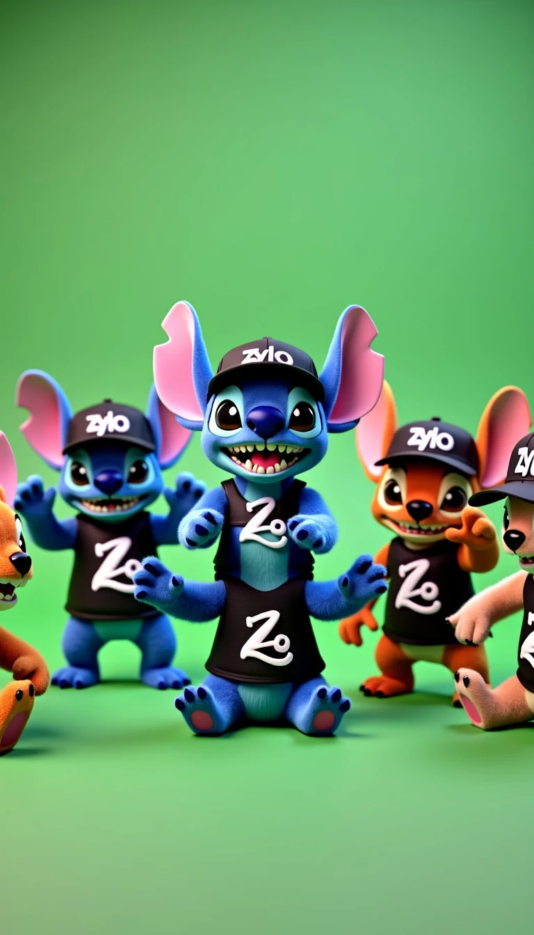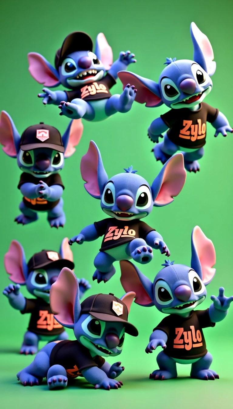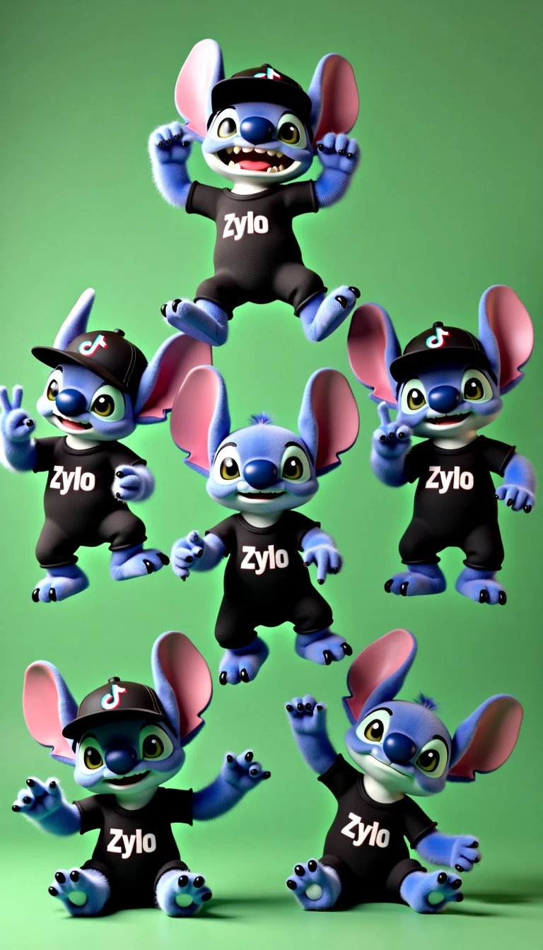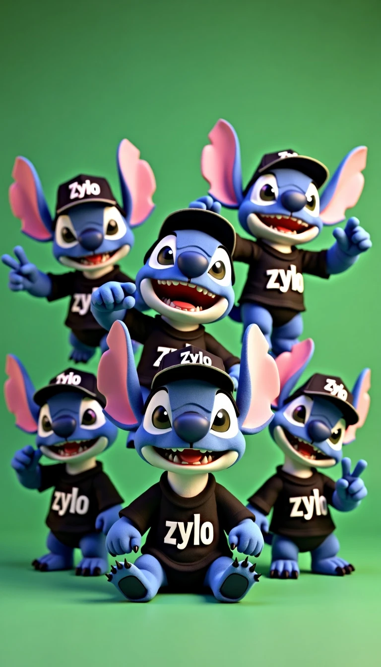 8K ultra-realistic wide-angle shot of seven 3D rendered Stitches in a photo session: Seven mischievous, furry Stitches are scattered throughout the shot, each in a unique pose, showcasing their playful personalities. Each Stitch is wearing a black trucker hat with the TikTok logo displayed on the front, along with stylish jumpers featuring large, bold "Zylo" letters. The lighting brings out every soft strand of fur, making them appear life-like, as if they exist in the real world. Each Stitch strikes a different pose: one is mid-jump, another flexes his muscles, one is sitting cross-legged, another waves at the camera, one does a peace sign, and two others pose like they’re in a dance-off. Their mischievous expressions vary, giving each Stitch a distinct character. The camera angle is set to f/18 with a wide-angle perspective, ensuring all seven Stitches are sharply detailed. Their paws, ears, and facial features are highly realistic and detailed. The entire scene is placed against a one-color green screen background for easy background changes during editing.
