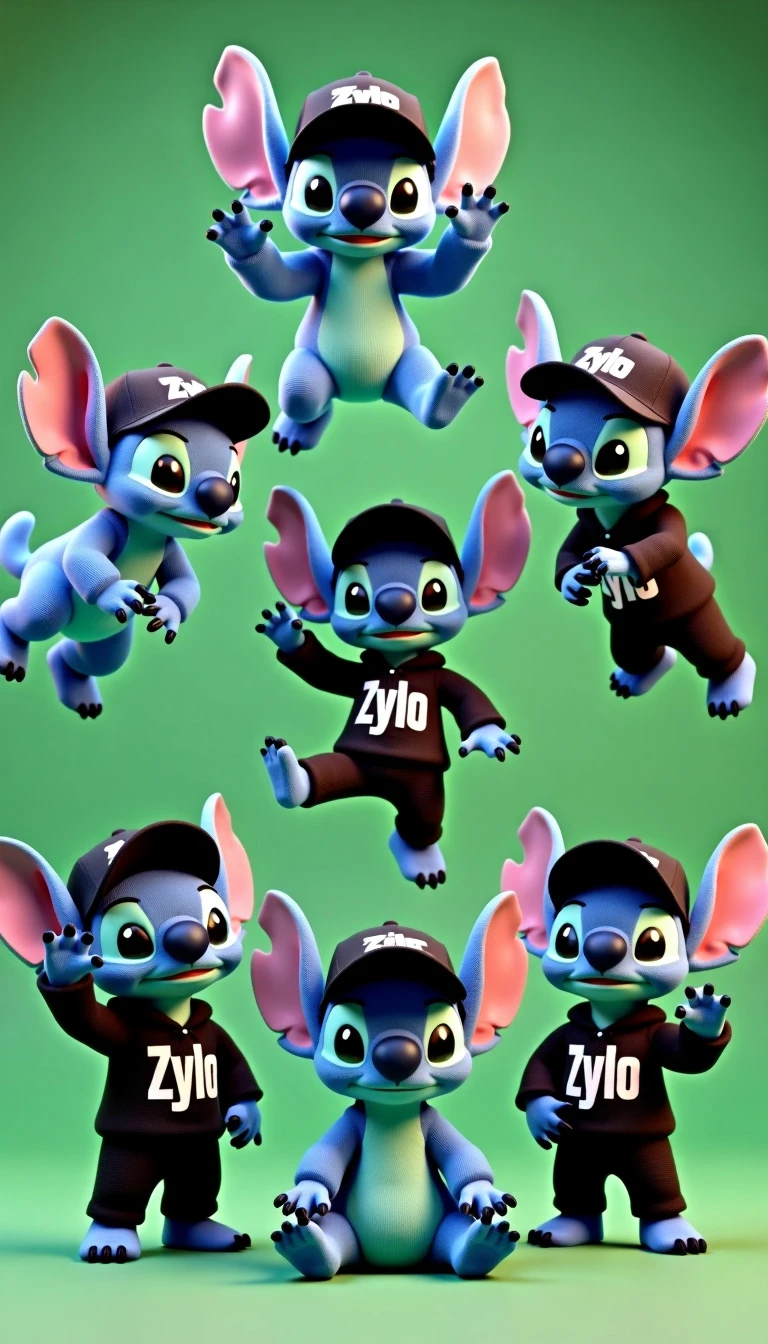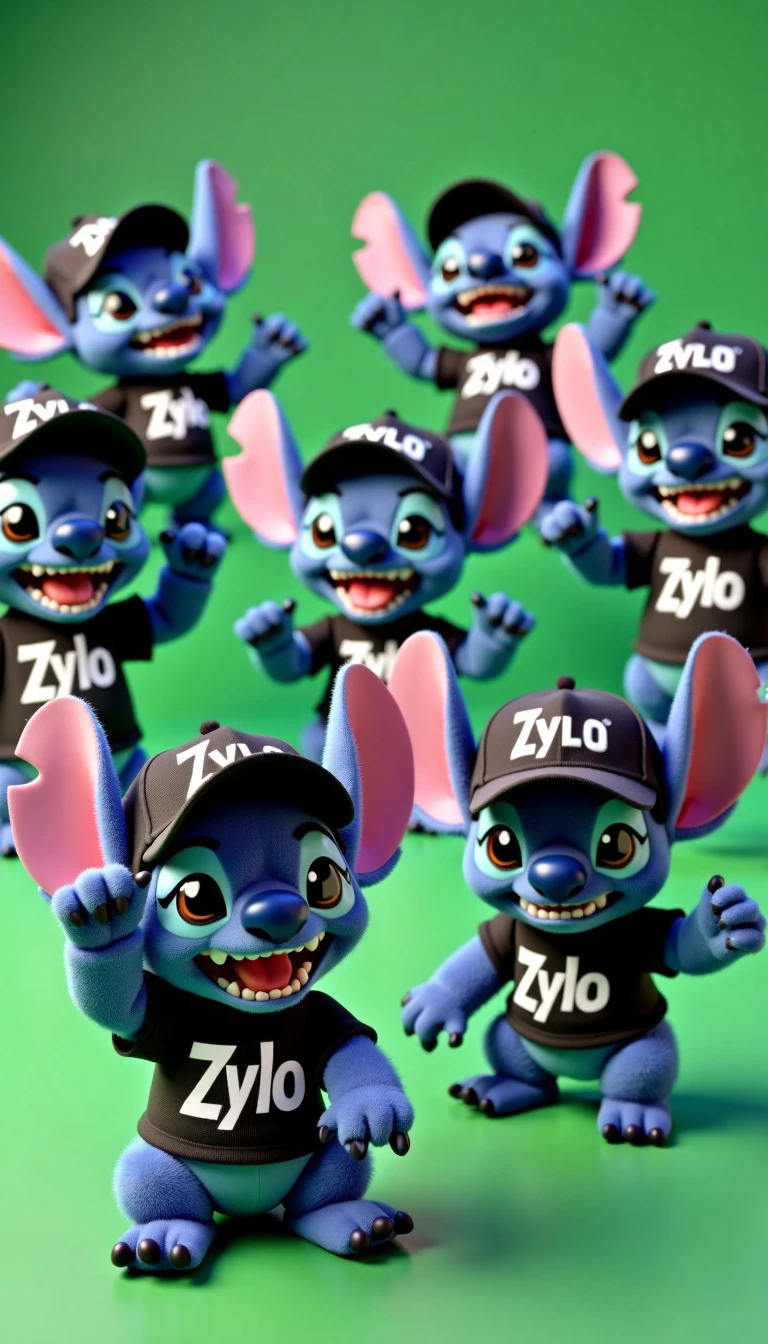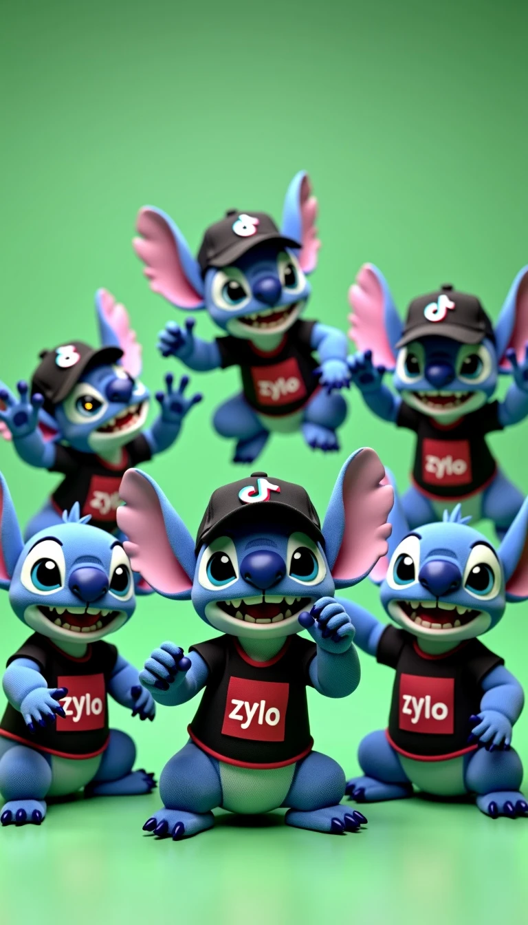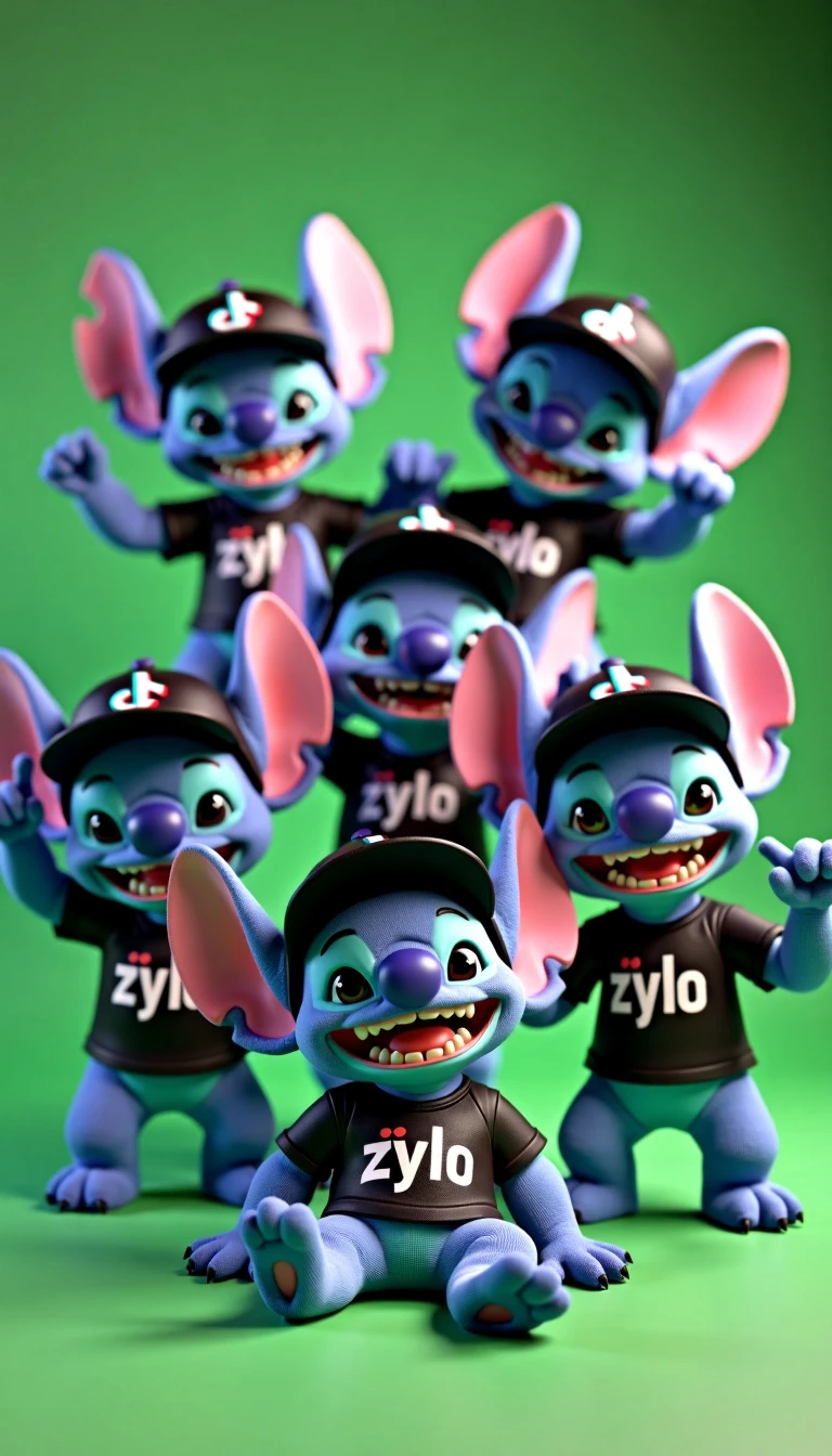 8K ultra-realistic wide-angle shot of seven 3D rendered Stitches in a photo session: Seven mischievous, furry Stitches are scattered throughout the shot, each in a unique pose, showcasing their playful personalities. Each Stitch is wearing a black trucker hat with the TikTok logo displayed on the front, along with stylish jumpers featuring large, bold "Zylo" letters. The lighting brings out every soft strand of fur, making them appear life-like, as if they exist in the real world. Each Stitch strikes a different pose: one is mid-jump, another flexes his muscles, one is sitting cross-legged, another waves at the camera, one does a peace sign, and two others pose like they’re in a dance-off. Their mischievous expressions vary, giving each Stitch a distinct character. The camera angle is set to f/18 with a wide-angle perspective, ensuring all seven Stitches are sharply detailed. Their paws, ears, and facial features are highly realistic and detailed. The entire scene is placed against a one-color green screen background for easy background changes during editing.