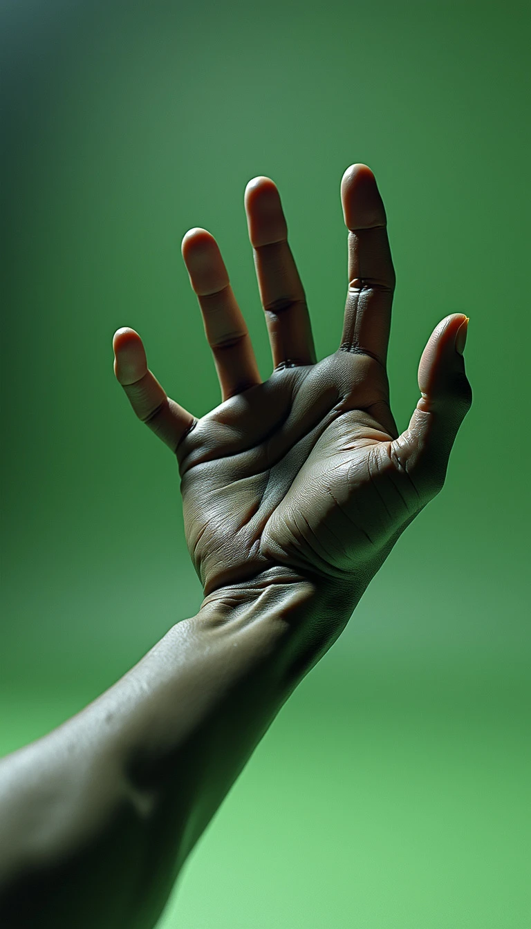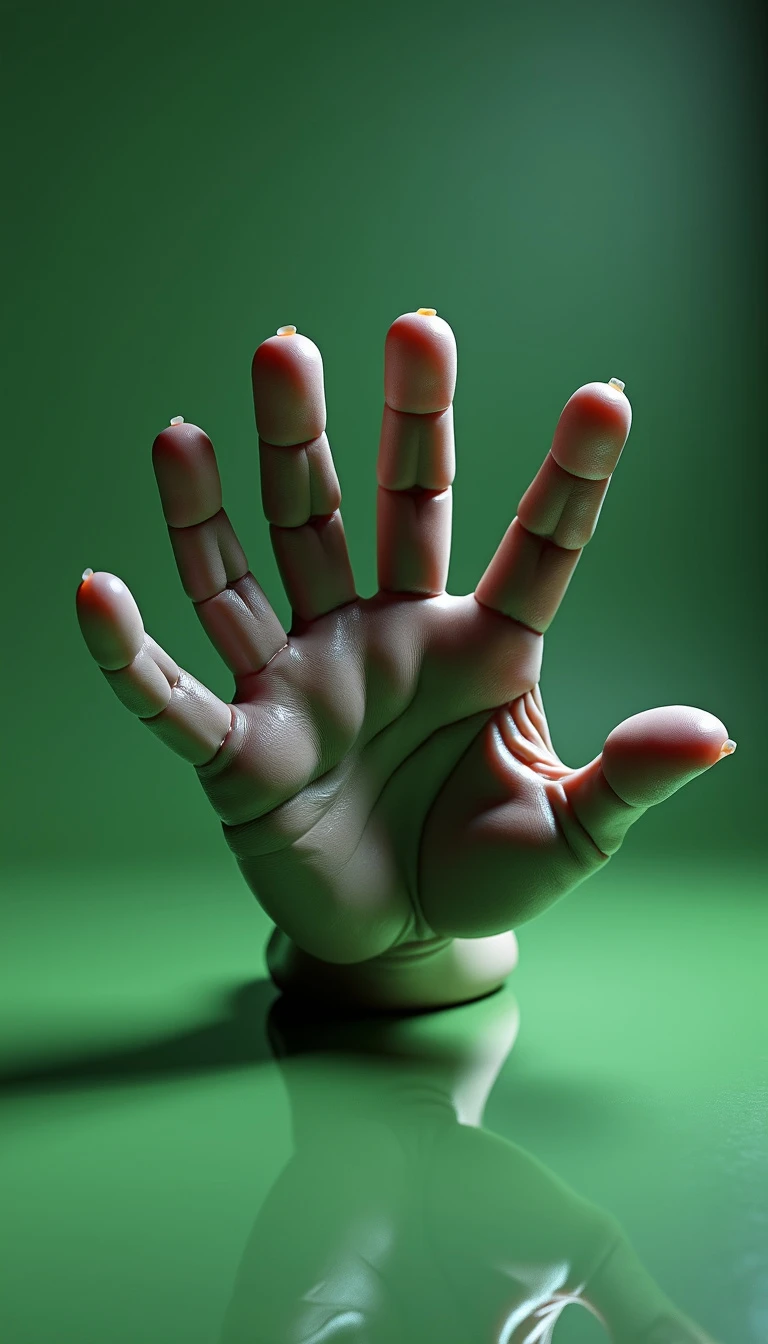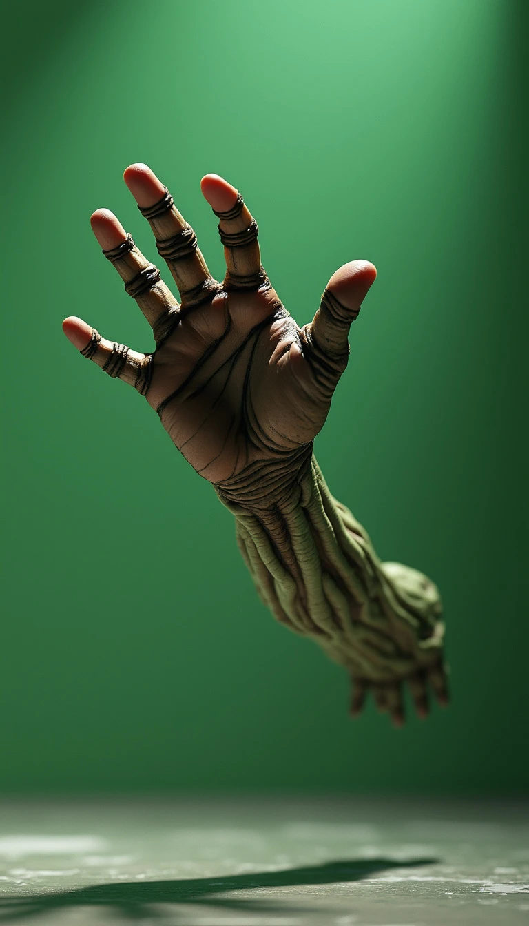 8K ultra-realistic 3D rendered image of a hand similar to "Thing" from The Addams Family: A lifelike, detailed 3D hand with an eerie, slightly weathered texture, resembling "Thing" from The Addams Family, is mid-leap as if jumping to grab something just out of reach. The hand appears animated, with its fingers spread in a grabbing motion, giving a dynamic, energetic feel as it reaches forward. The lighting captures the shadows and creases in the skin, making the hand look ultra-realistic and detailed, while emphasizing the stretch in its fingers. The background is a simple, one-color green screen for easy background removal and editing in post-production. The scene is captured from a wide-angle perspective with the hand in sharp focus, showing its slight reflection on the floor, further enhancing the 3D effect.