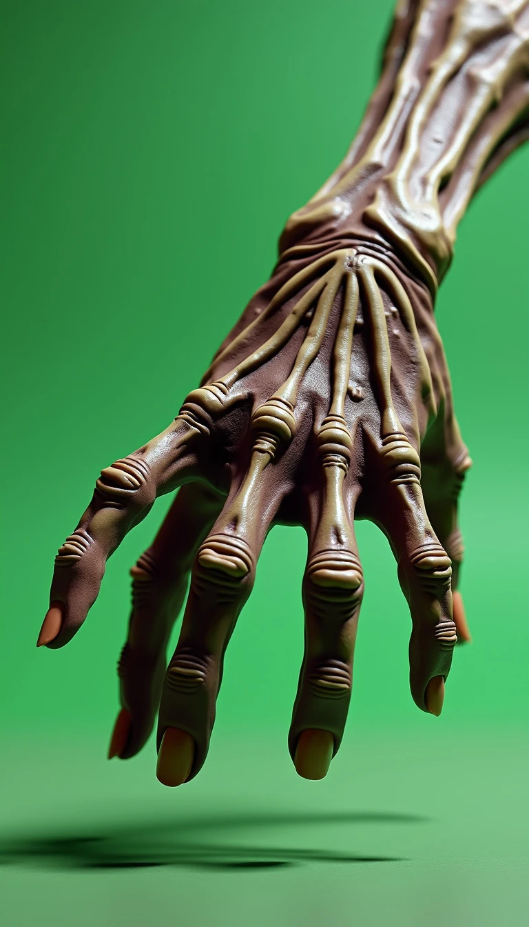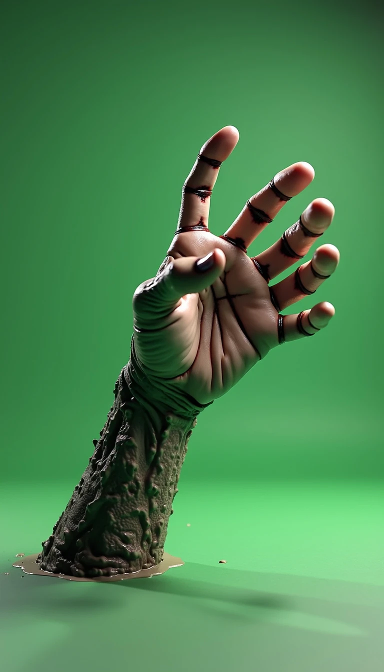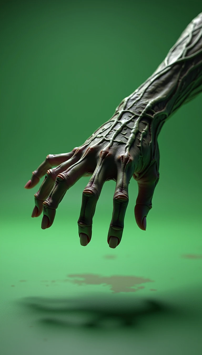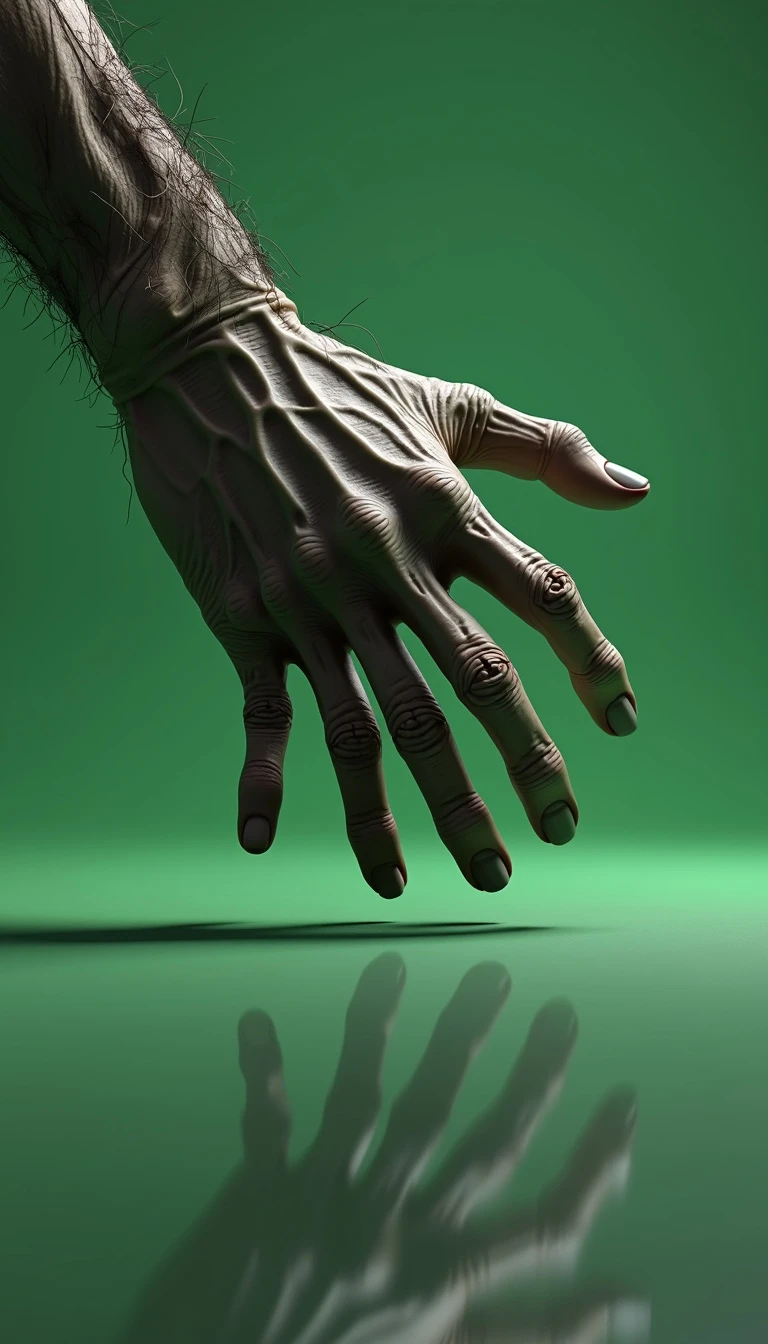 8K ultra-realistic 3D rendered image of a hand similar to "Thing" from The Addams Family: A lifelike, detailed 3D hand with an eerie, slightly weathered texture, resembling "Thing" from The Addams Family, is mid-leap as if jumping to grab something just out of reach. The hand appears animated, with its fingers spread in a grabbing motion, giving a dynamic, energetic feel as it reaches forward. The lighting captures the shadows and creases in the skin, making the hand look ultra-realistic and detailed, while emphasizing the stretch in its fingers. The background is a simple, one-color green screen for easy background removal and editing in post-production. The scene is captured from a wide-angle perspective with the hand in sharp focus, showing its slight reflection on the floor, further enhancing the 3D effect.