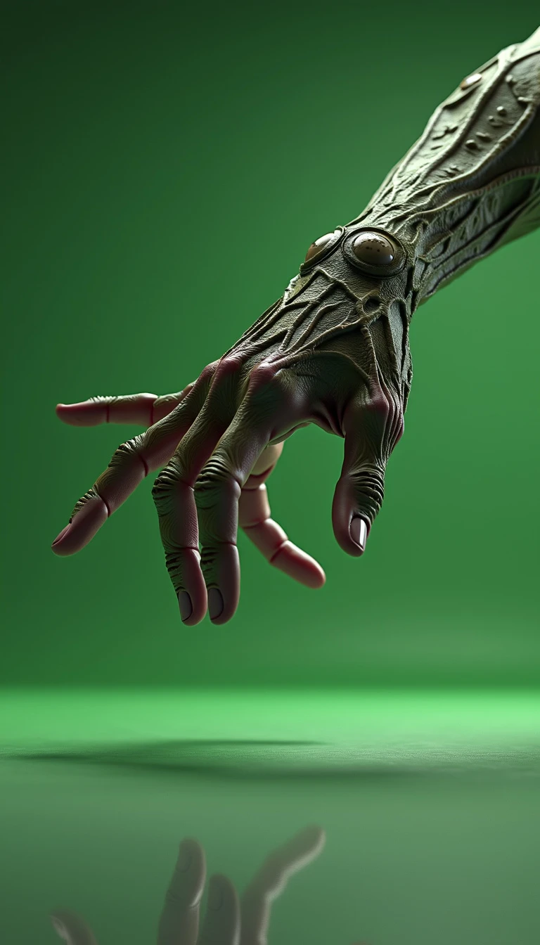 8K ultra-realistic 3D rendered image of a hand similar to "Thing" from The Addams Family: A lifelike, detailed 3D hand with an eerie, slightly weathered texture, resembling "Thing" from The Addams Family, is mid-leap as if jumping to grab something just out of reach. The hand appears animated, with its fingers spread in a grabbing motion, giving a dynamic, energetic feel as it reaches forward. The lighting captures the shadows and creases in the skin, making the hand look ultra-realistic and detailed, while emphasizing the stretch in its fingers. The background is a simple, one-color green screen for easy background removal and editing in post-production. The scene is captured from a wide-angle perspective with the hand in sharp focus, showing its slight reflection on the floor, further enhancing the 3D effect.