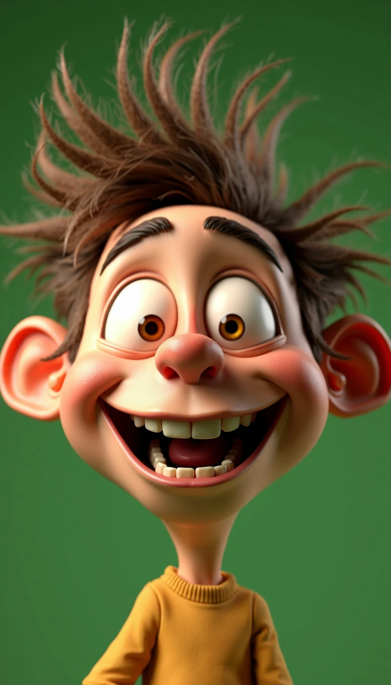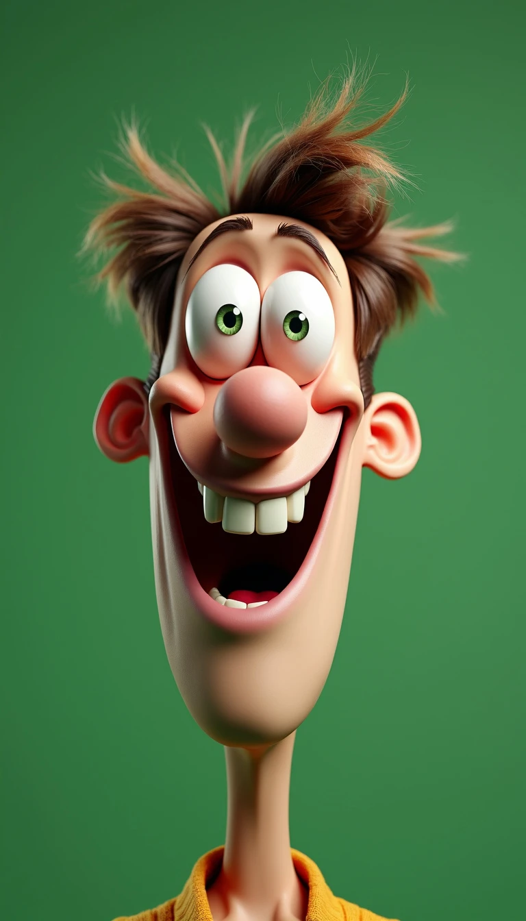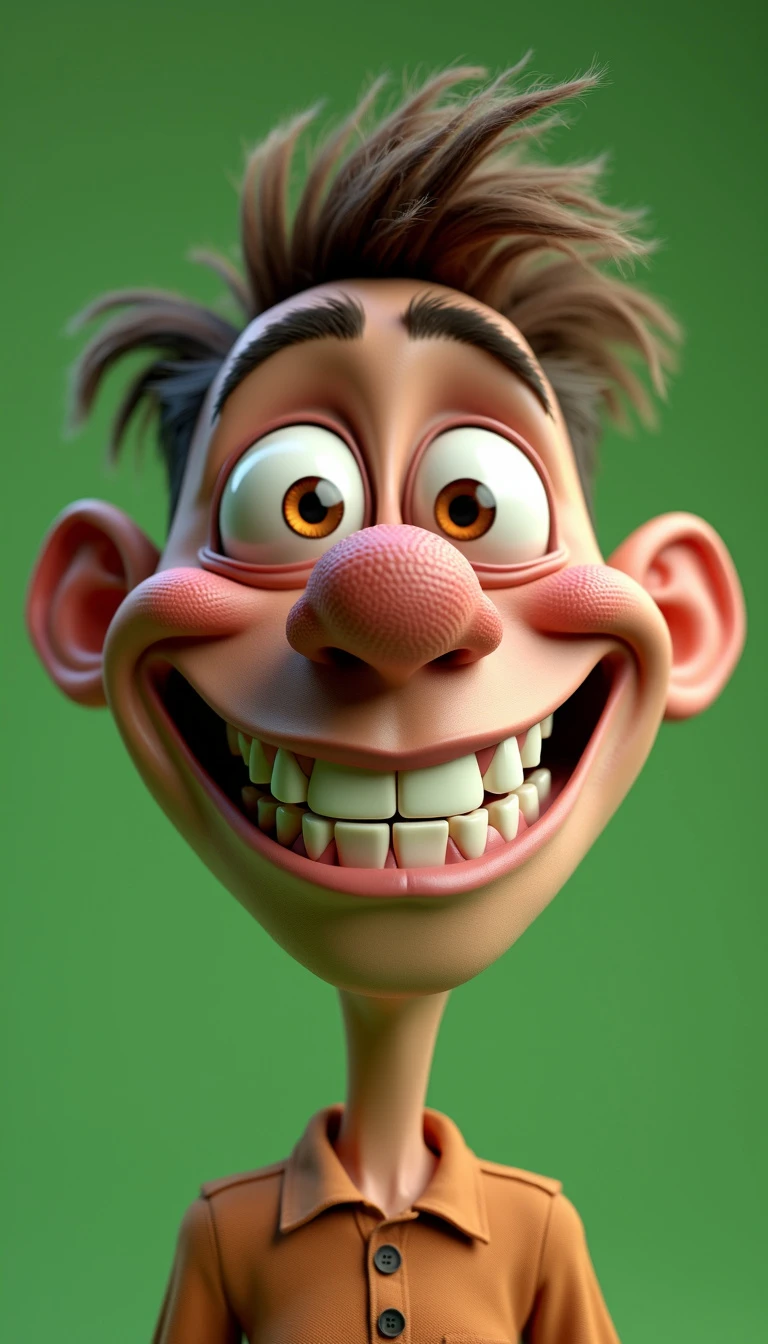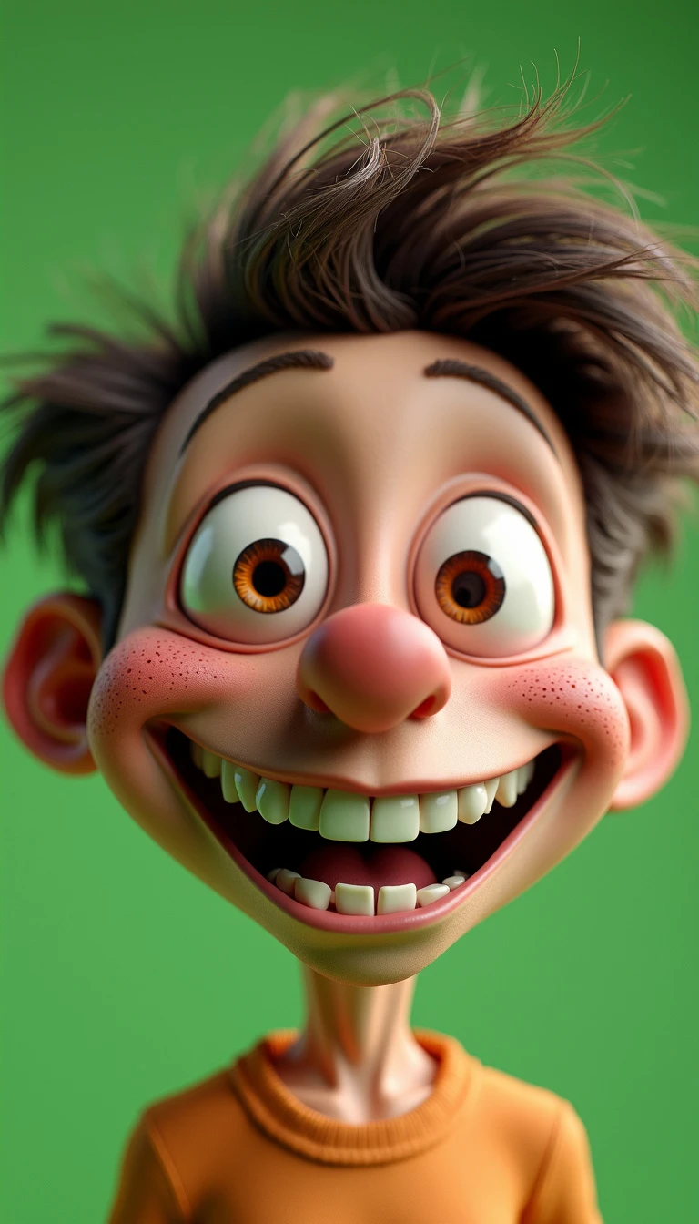 8K ultra-realistic 3D rendered character for lip-sync (green screen background): A humorous yet lifelike 3D-rendered character with exaggerated features but maintaining realistic human-like qualities. The character has a slightly oversized, round face with large, expressive eyes and a broad, toothy grin. The skin has a smooth, natural texture with subtle pores, ensuring human-like realism while still conveying a lighthearted and comedic charm. The character's lips are well-defined for precise lip-syncing, and the face is symmetrical with natural contours to ensure accurate AI recognition. The hair is playful and slightly messy, adding to the character’s quirky personality. The lighting is soft and realistic, creating depth and shadow on the character’s features. **The background is a solid, one-color green screen** for easy background changes in post-processing, making the character perfect for dynamic video or animation projects.