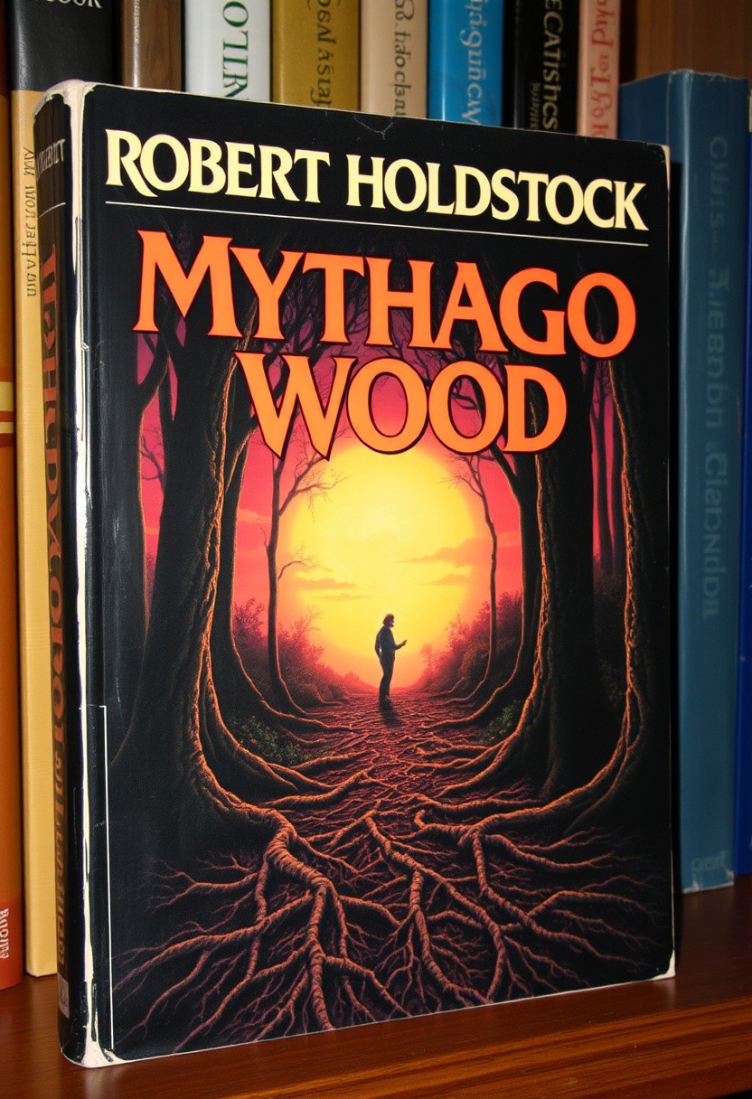 1970s Fantasy style book cover, with large bold text of "ROBERT HOLDSTOCK" along the top of the image, with the title of "Mythago Wood". artwork in the style of Geoff Taylor to show a dark fantasy forest landscape, sunset, with a mythical being standing at the end of a path covered in tree roots and leaves. The hardback book is sitting on a bookshelf