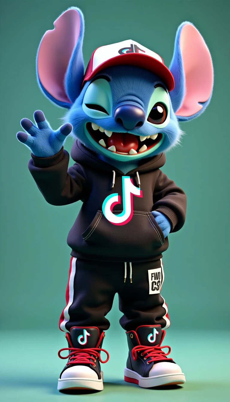 8K 3D-rendered full-body image** of Stitch in a **9:16 vertical frame**, wearing **urban streetwear**. Stitch is dressed in a sleek, branded **TikTok tracksuit** with a hoodie, featuring bold, neon accents, and rocking **high-top trainers** with the TikTok logo. He’s also sporting a **TikTok-branded trucker hat**, slightly tilted for a stylish look. His **expressive face** is filled with playful energy, as he’s **winking with one eye** and **waving his hand cheerfully** at the viewer. Stitch's blue fur is highly detailed with soft shadows and highlights, giving a realistic, fluffy texture. The **background is a solid green screen**, allowing for easy customization of the backdrop. The lighting highlights Stitch’s outfit and his movements, creating depth, while the wide-angle shot makes him the clear focus of the image, emphasizing the dynamic pose. Ultra realistic