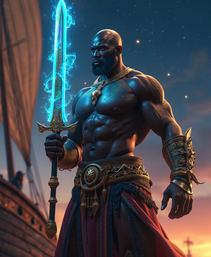 Image Description: Shango stands proudly in front of an ancient African longship, his muscular form radiating strength and power. His left hand grasps a glowing sword of justice, imbued with a steel-blue aura that pulses with magical energy. The sword's blade shimmers with multi-colored iridescence, reflecting the intricate patterns and textures on Shango's armor. Artistic Style: The image blends the styles of Simon Bisley and Todd Lockwood, combining dynamic composition, intricate details, and hyper-realistic texture quality. The artwork showcases Shango's majestic presence, emphasizing his godly status and mythological significance. Background: The African longship looms in the background, its wooden planks weathered to a rich, dark brown. The ship's sails billow in the wind, creating a sense of movement and energy. The sky above is a deep shade of indigo, with stars twinkling like diamonds against the darkness. Lighting: Dramatic lighting highlights Shango's form, emphasizing his muscular physique and intricate armor details. Volumetric light effects create a sense of presence and depth, making Shango appear as if he's standing right in front of you. The steel-blue aura surrounding him adds an otherworldly quality to the image. Textures and Details: The image features exquisite textures that emphasize Shango's godly status and mythological significance. His armor is adorned with intricate patterns and symbols, reflecting African mythological elements and concepts of honor and sacrifice. The sword's blade shimmers with iridescence, adding a touch of magic to the image. Technical Specifications: The image was created at 8K resolution, using Unreal Engine 5 render for cutting-edge visuals and realism. Ultra-high detail and texture quality ensure an immersive experience, with an emphasis on depth and dimensionality.