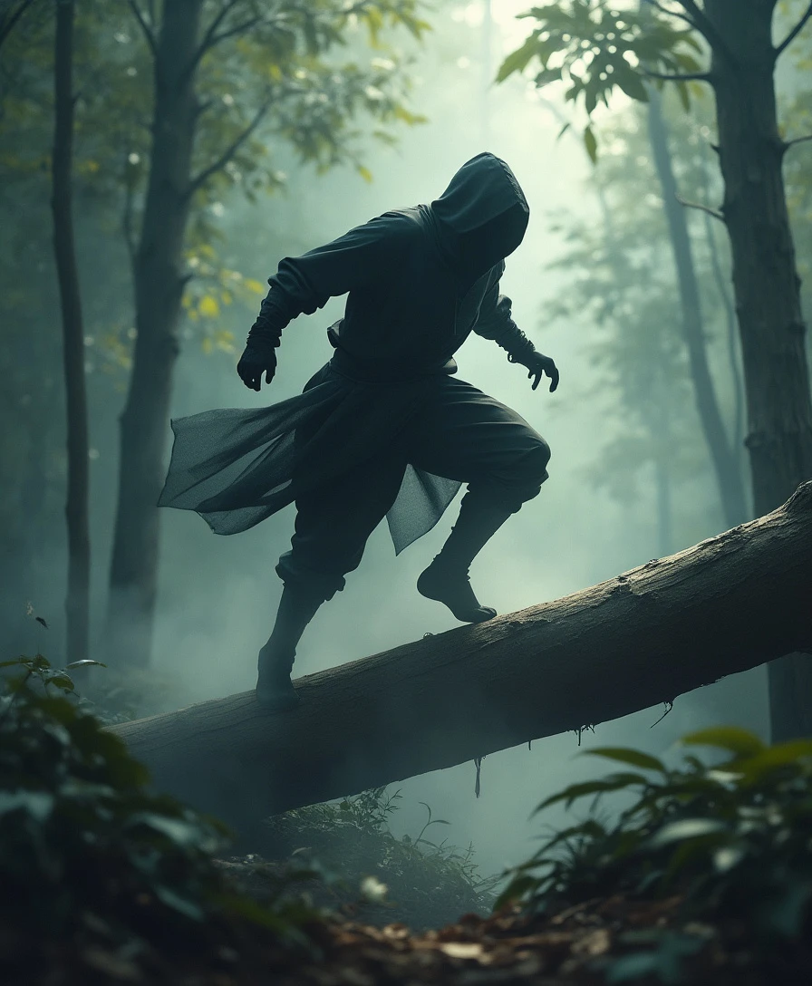 A stealthy shadow ninja leaping over a fallen log, dense misty rainforest background, dappled sunlight filtering through canopy, early morning atmosphere, hyper-realistic digital painting, muted color palette with emphasis on grays and blacks, ultra high definition, cinematic 8k UHD. The air is heavy with an unsettling silence, as if the forest itself is holding its breath in anticipation of the ninja's next move. The dappled sunlight creates long, ominous shadows that stretch across the forest floor, while the mist swirls around the fallen log like a malevolent entity. The ninja's face remains obscured by their black hood, adding to the sense of mystery and foreboding.